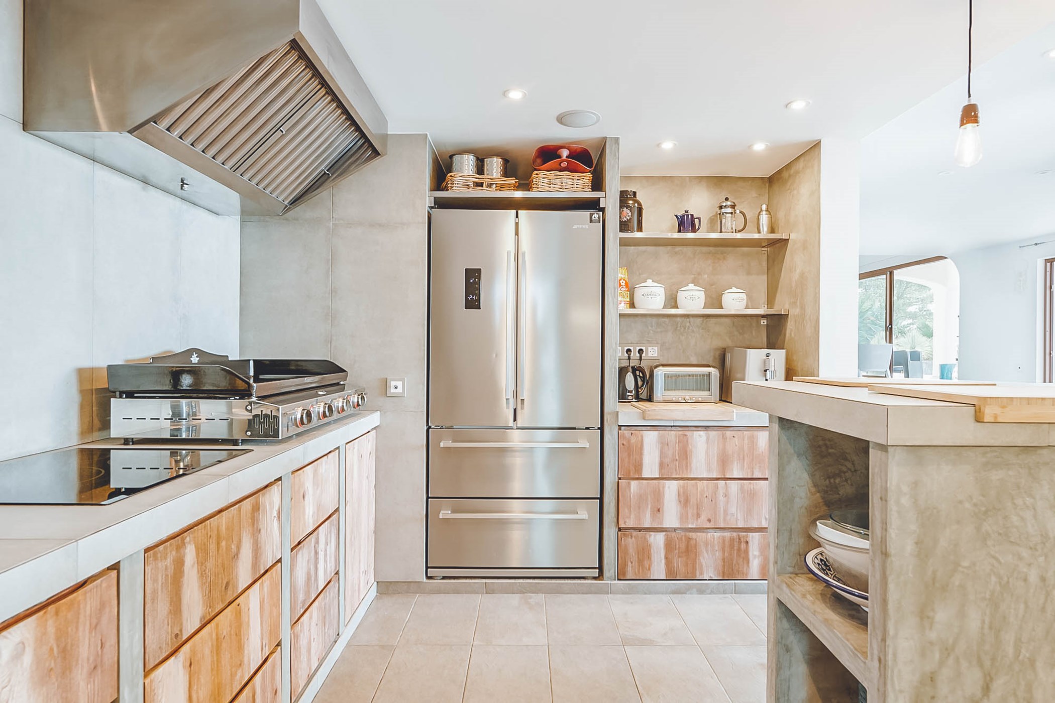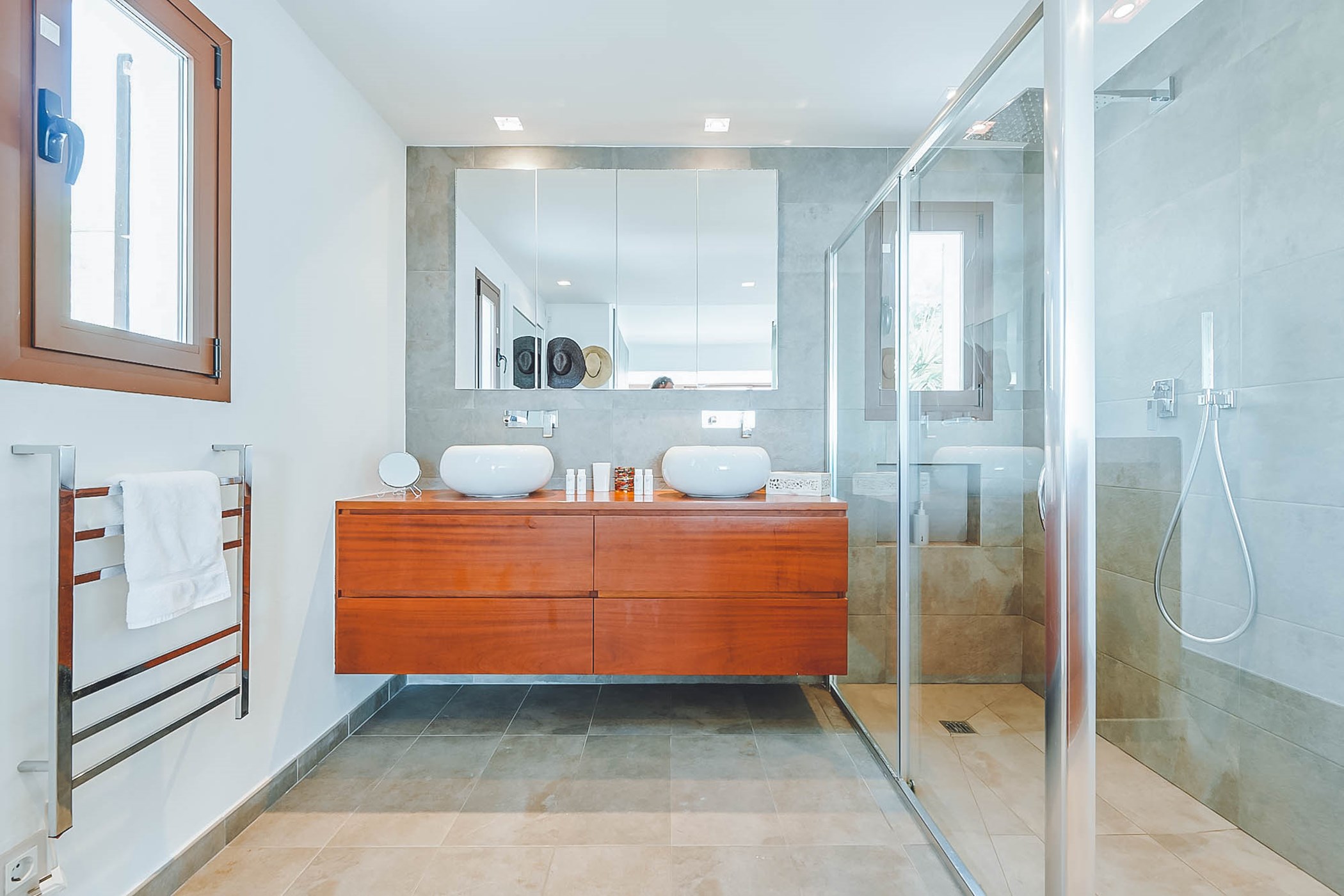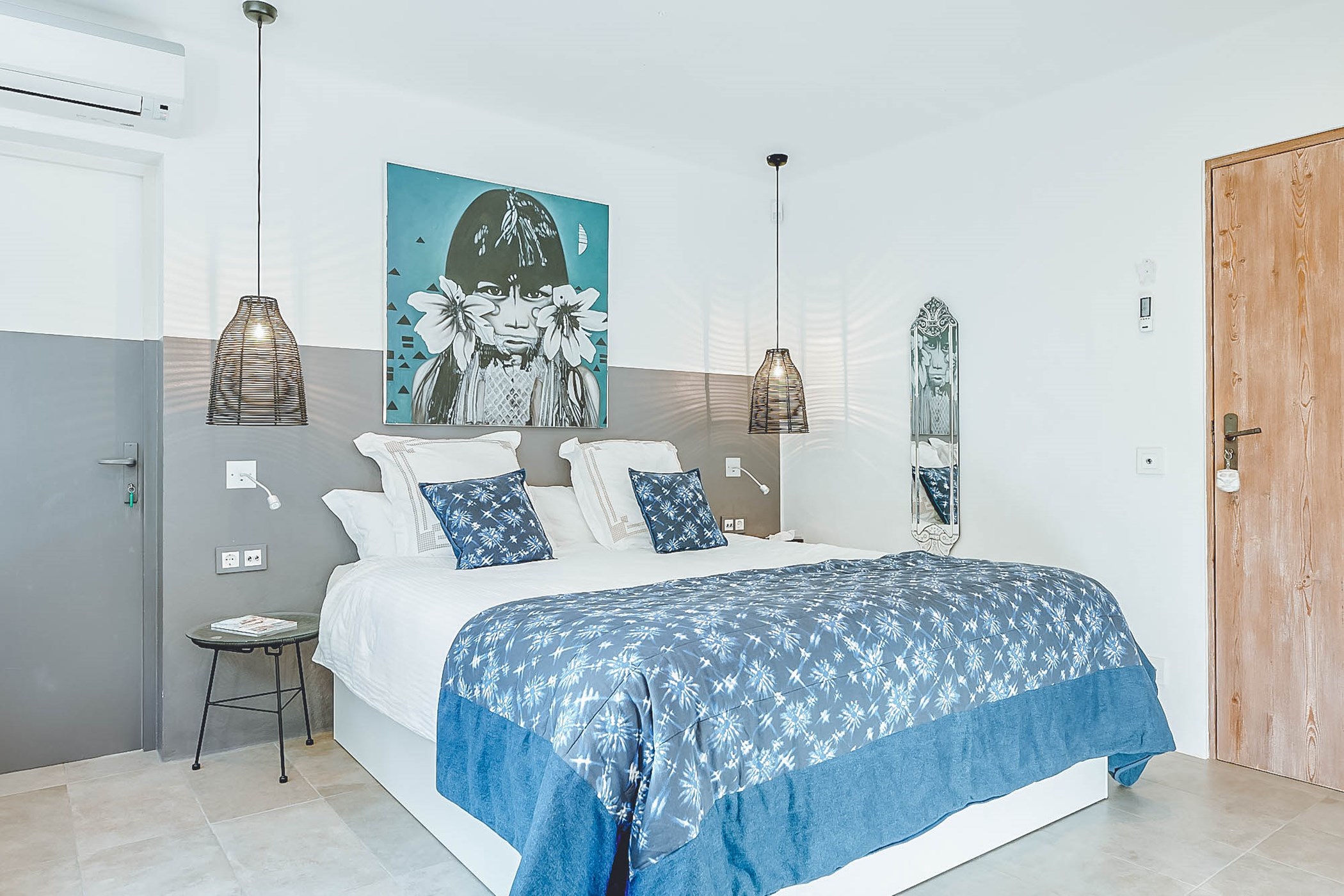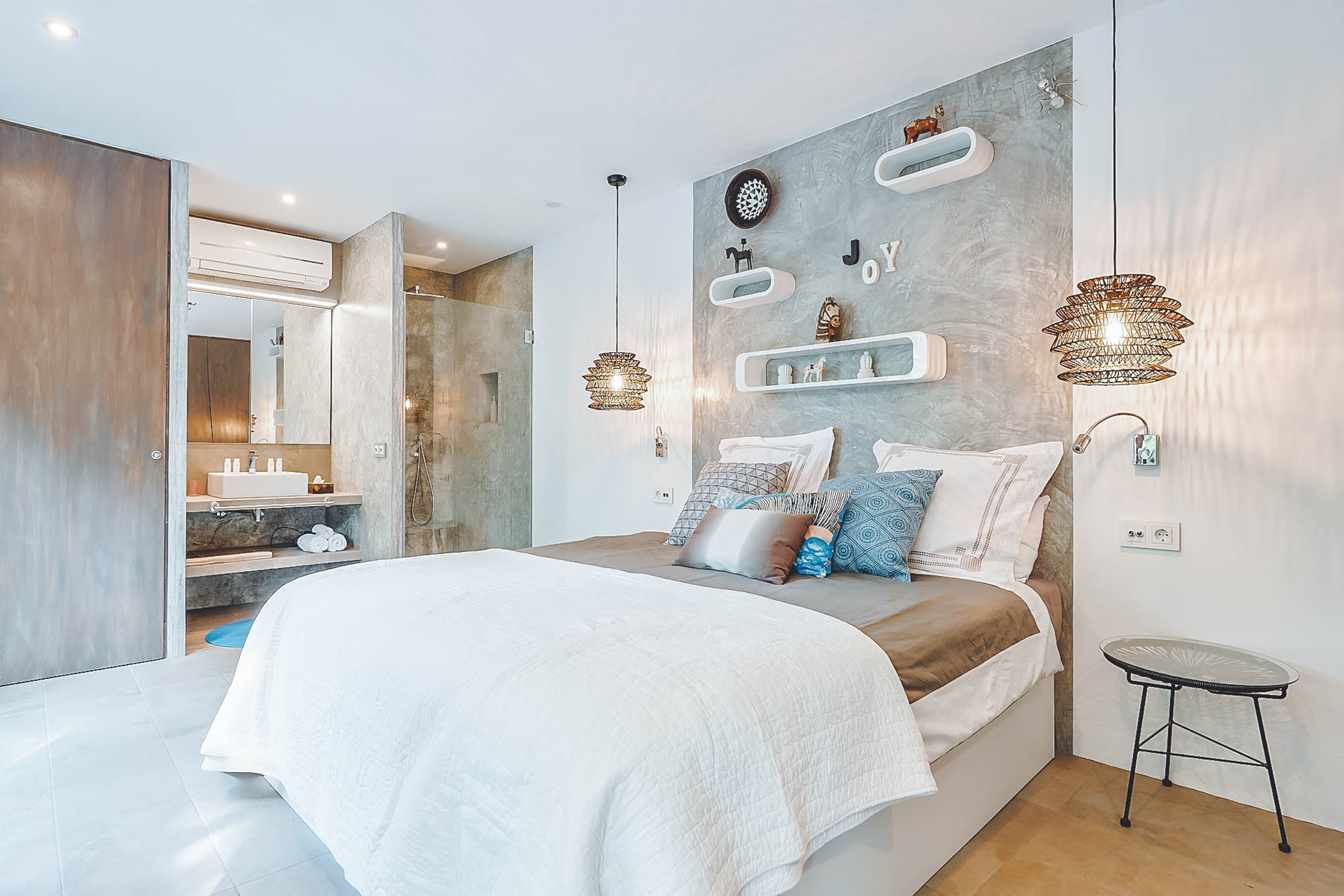 Spread over two floors, the villa features four double bedrooms, each with a shower, offering space and privacy. The two bedrooms on the top floor share a toilet suite, while a fifth double en-suite bedroom is accessed externally under the swimming pool. Every room exudes unique charm and subtle style.