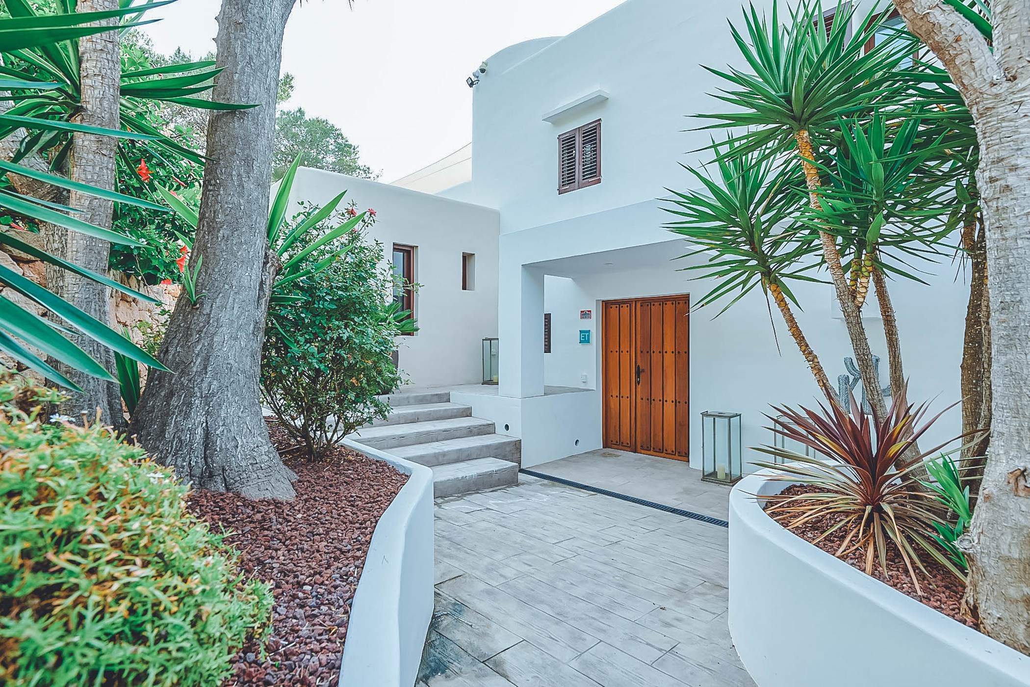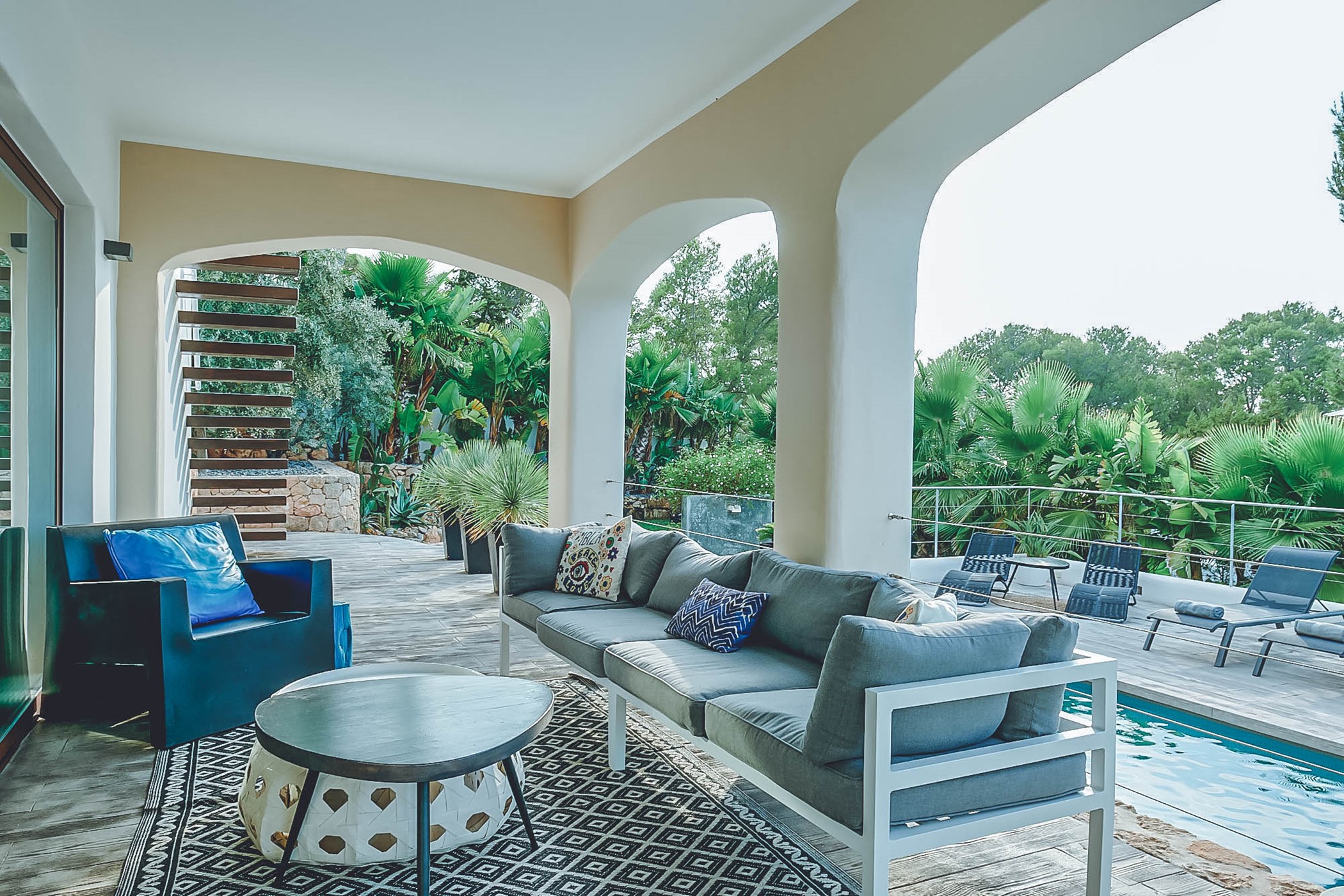 Can Chloe's exterior boasts lush gardens with palms and tropical plants, creating a delightful retreat. The sleek pool area features a wide wooden terrace lined with sun loungers and shaded seating. Stylish steps lead up to the upper terrace where guests can relax on a large sofa, entertain with a barbecue, fully equipped summer kitchen, and al-fresco dining table for 10 while enjoying the breathtaking sea views. The villa's prime feature is the sought-after nightly displays of the world-famous Ibizan sunset, making it one of the most desirable villas on the island.