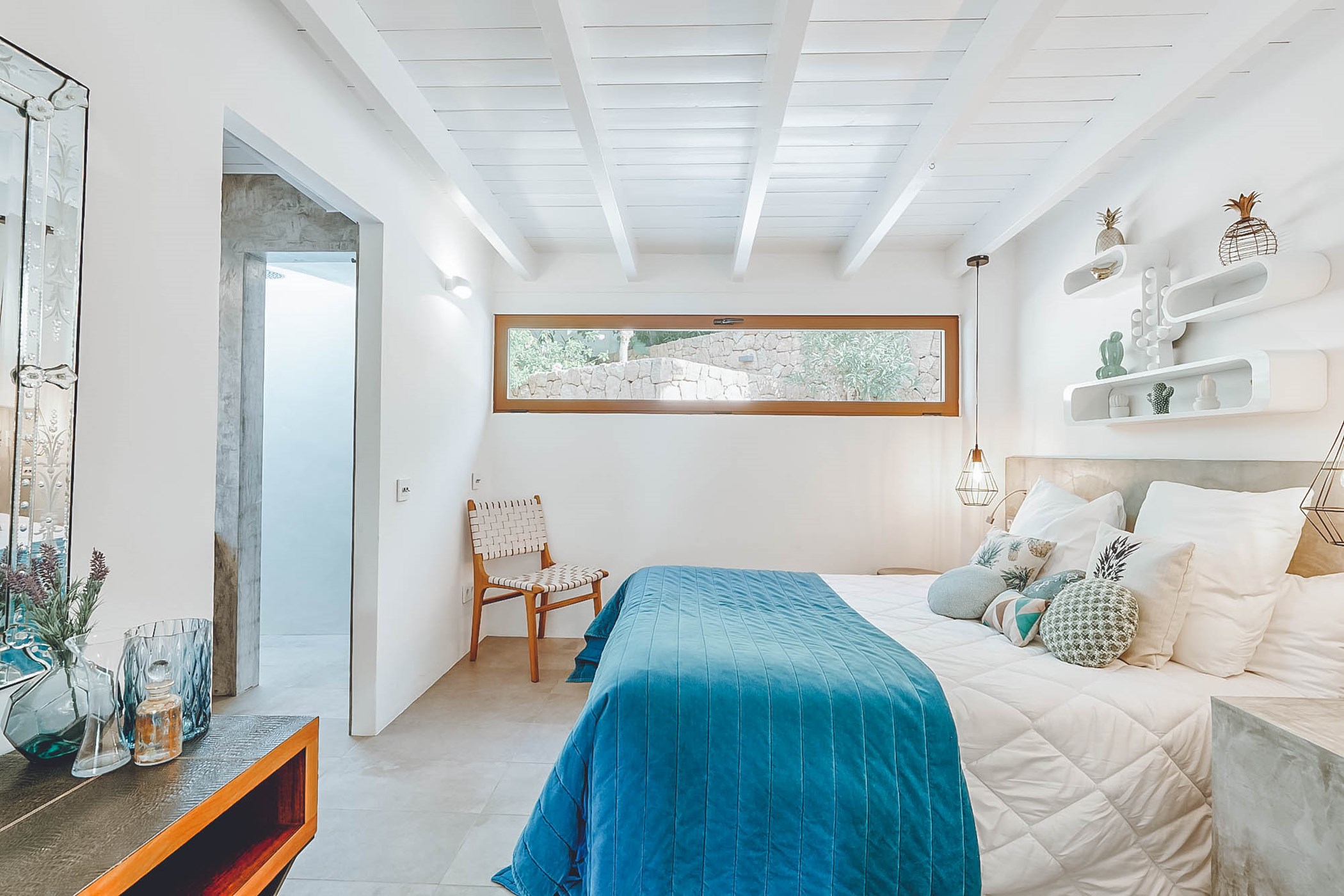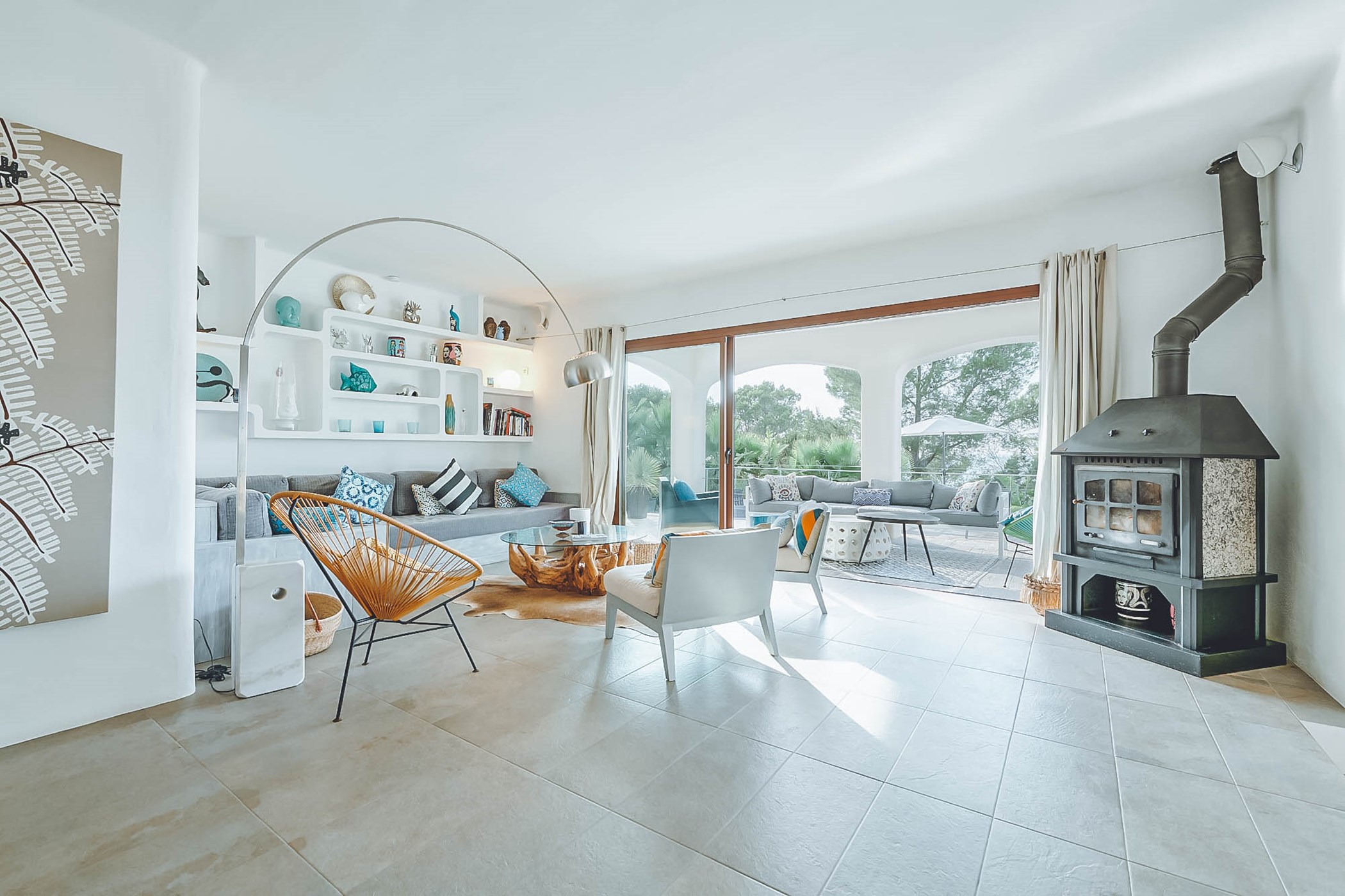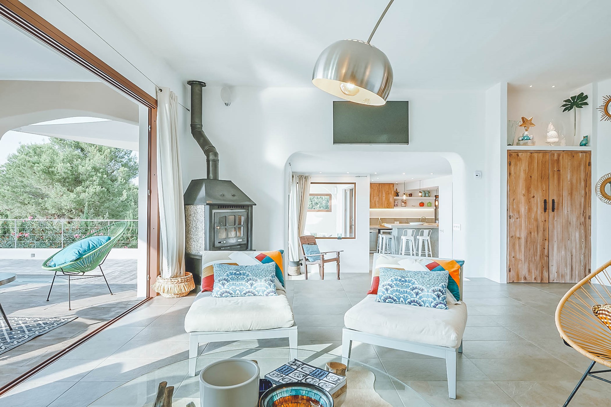 Adorned with white walls, natural wood, and polished tile floors, Can Chloe's interior is tastefully furnished with colorful accents. The spacious living room seamlessly connects to a large, well-equipped kitchen and breakfast bar that leads to a sun-drenched breakfast table for eight guests. The sophisticated decor and elegant artwork create a sublime ambiance throughout this stylish home.