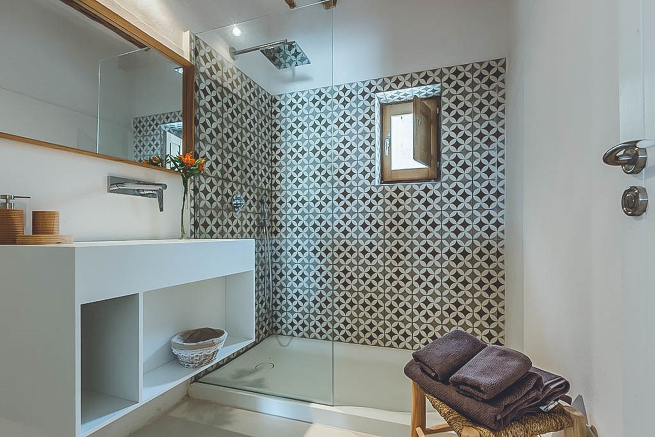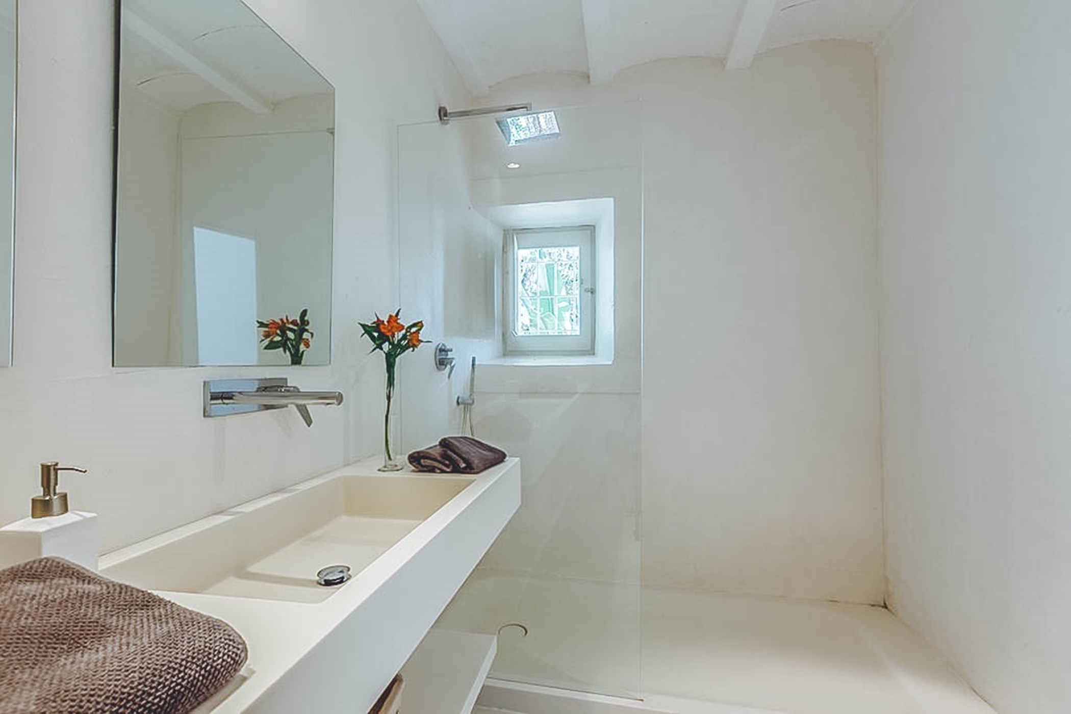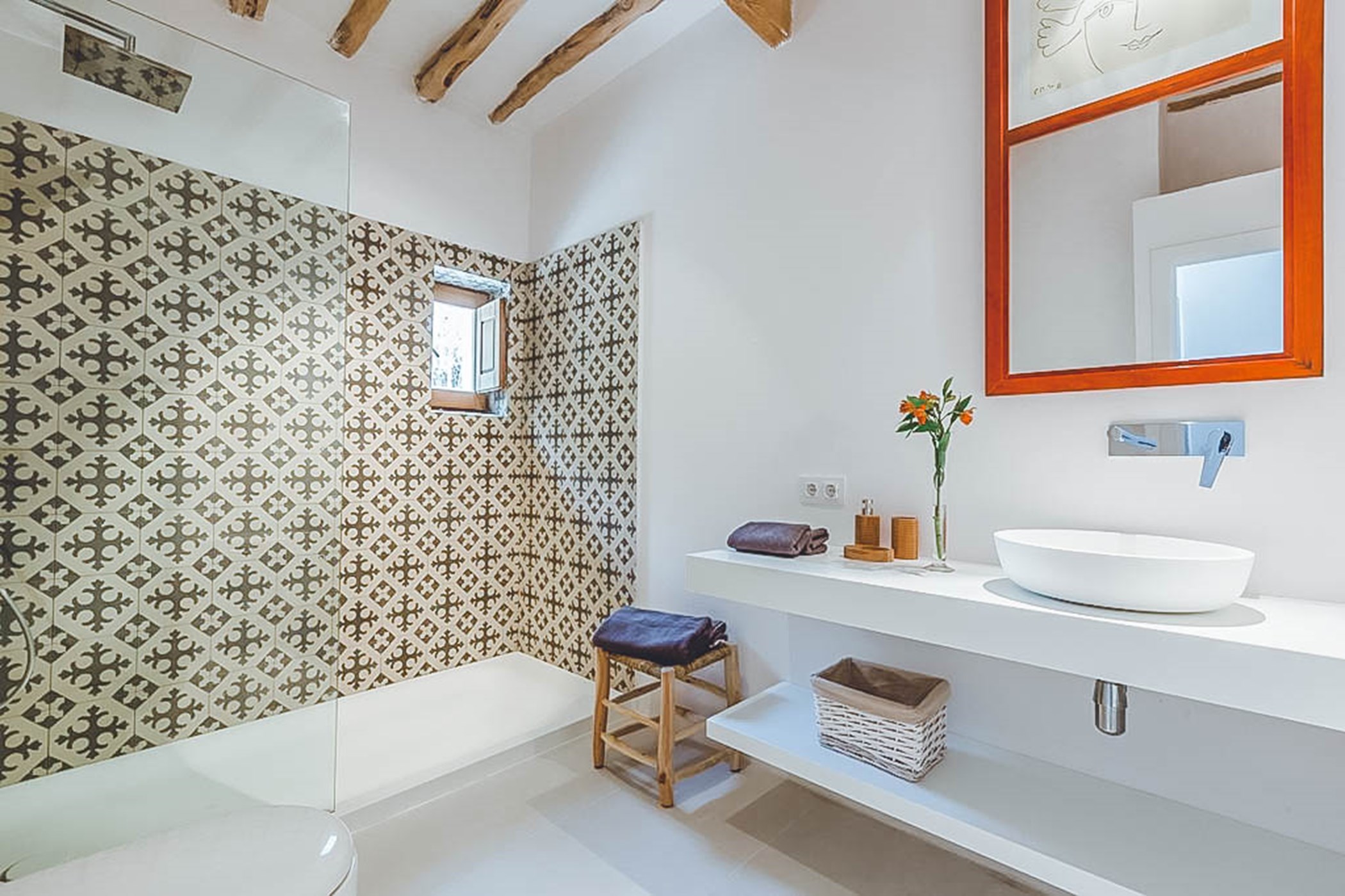 Step outside and discover the beautiful outdoor spaces of Can Rowan. The central porch provides a shaded dining area and a BBQ space, perfect for alfresco entertaining. A comfortable chill-out space and outdoor loungers invite you to relax and unwind. The private pool is surrounded by sun loungers, and an outdoor bathroom and shower add convenience to your outdoor experience.
