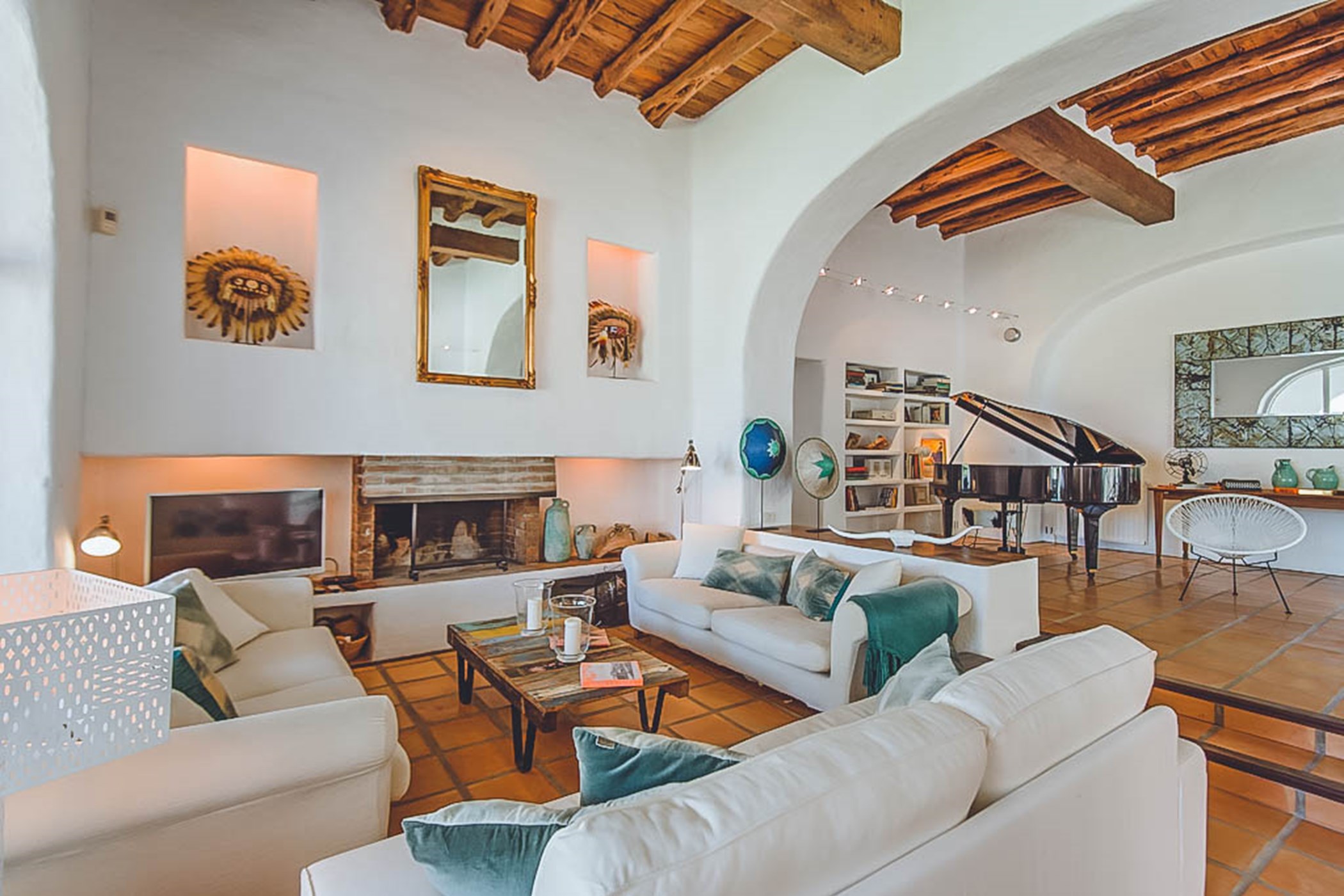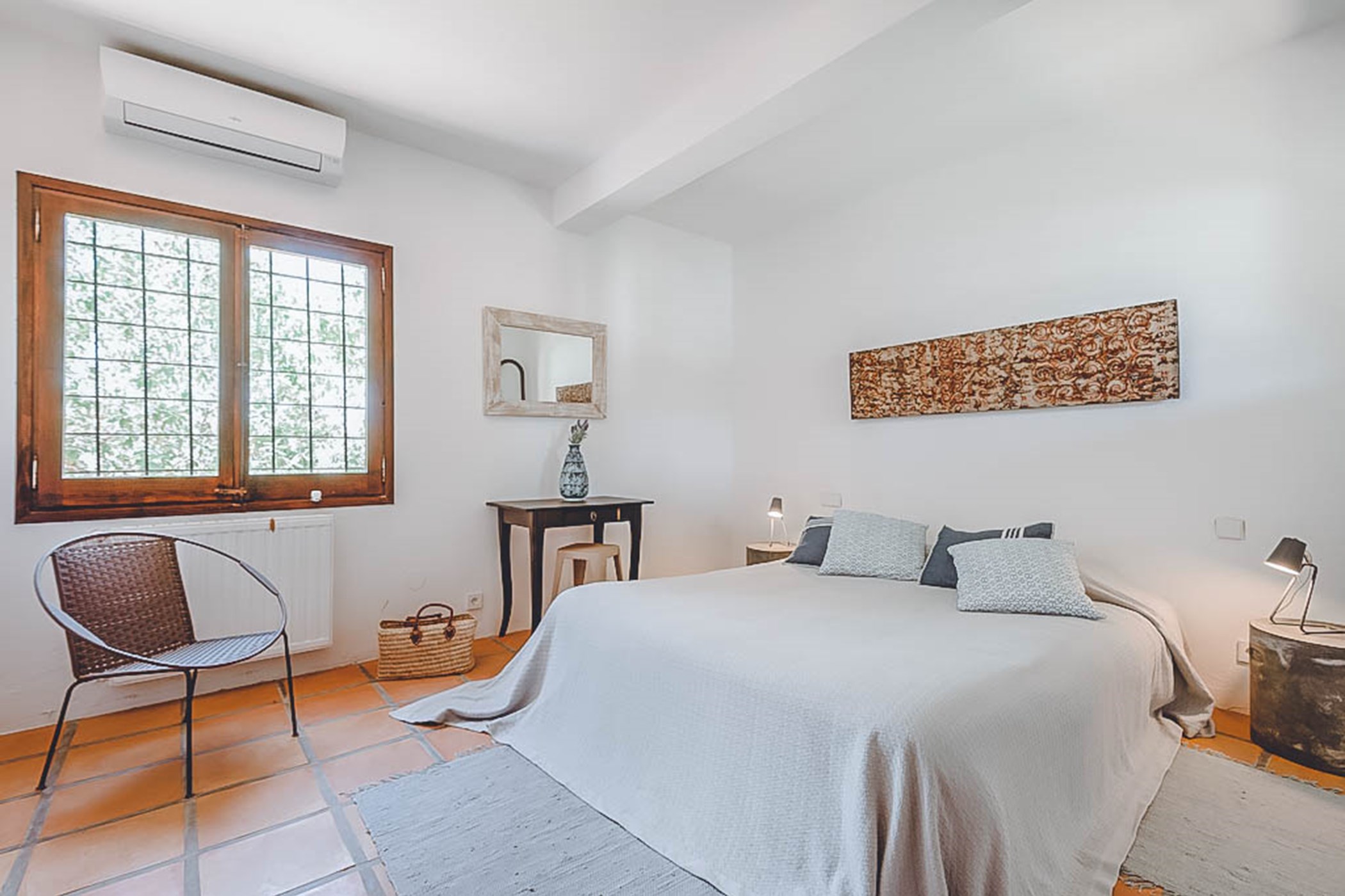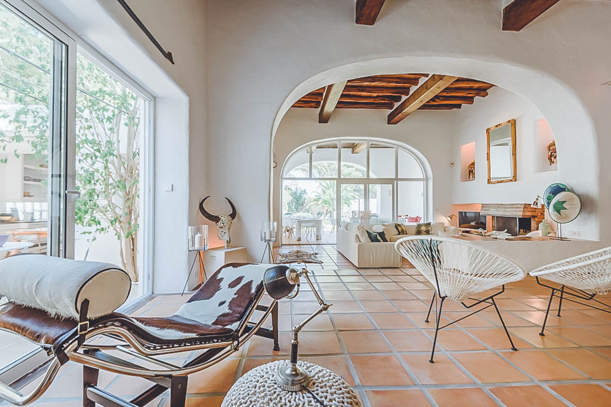 Step into the beautiful and spacious living areas of Can Sandra, where contemporary bohemian style meets rustic charm. The large open-plan lounge and fully equipped kitchen feature high wooden sabina beamed ceilings and a comfortable sofa area. French doors open onto an outside porch with a grand-sized exterior dining table, creating the perfect spot to enjoy meals while embracing the tranquil surroundings.