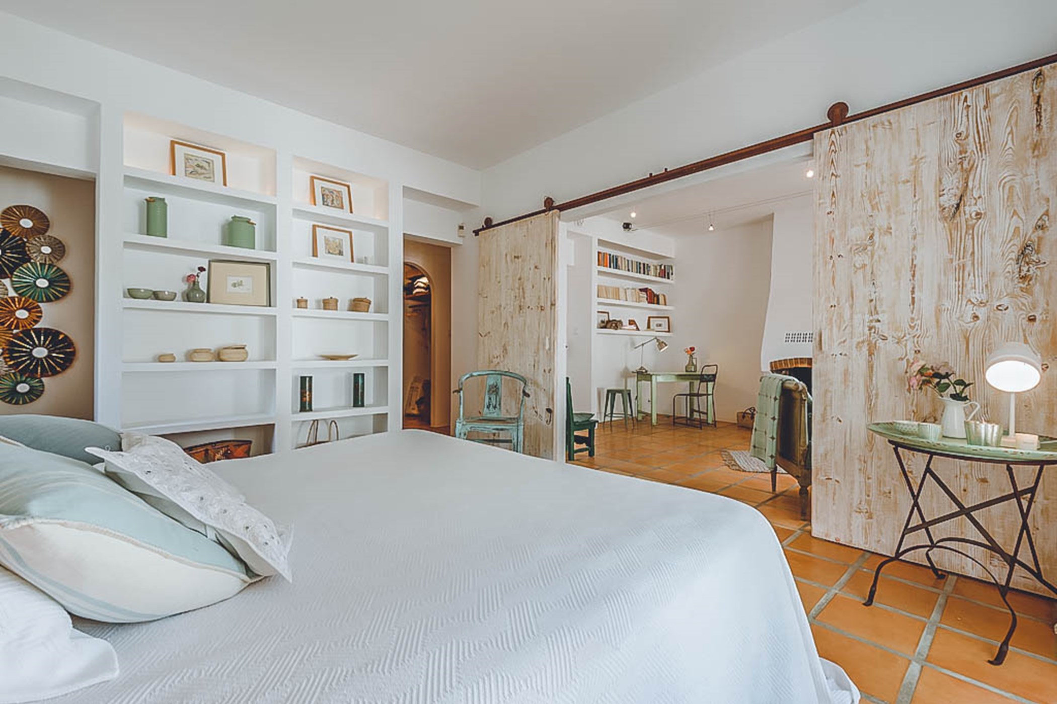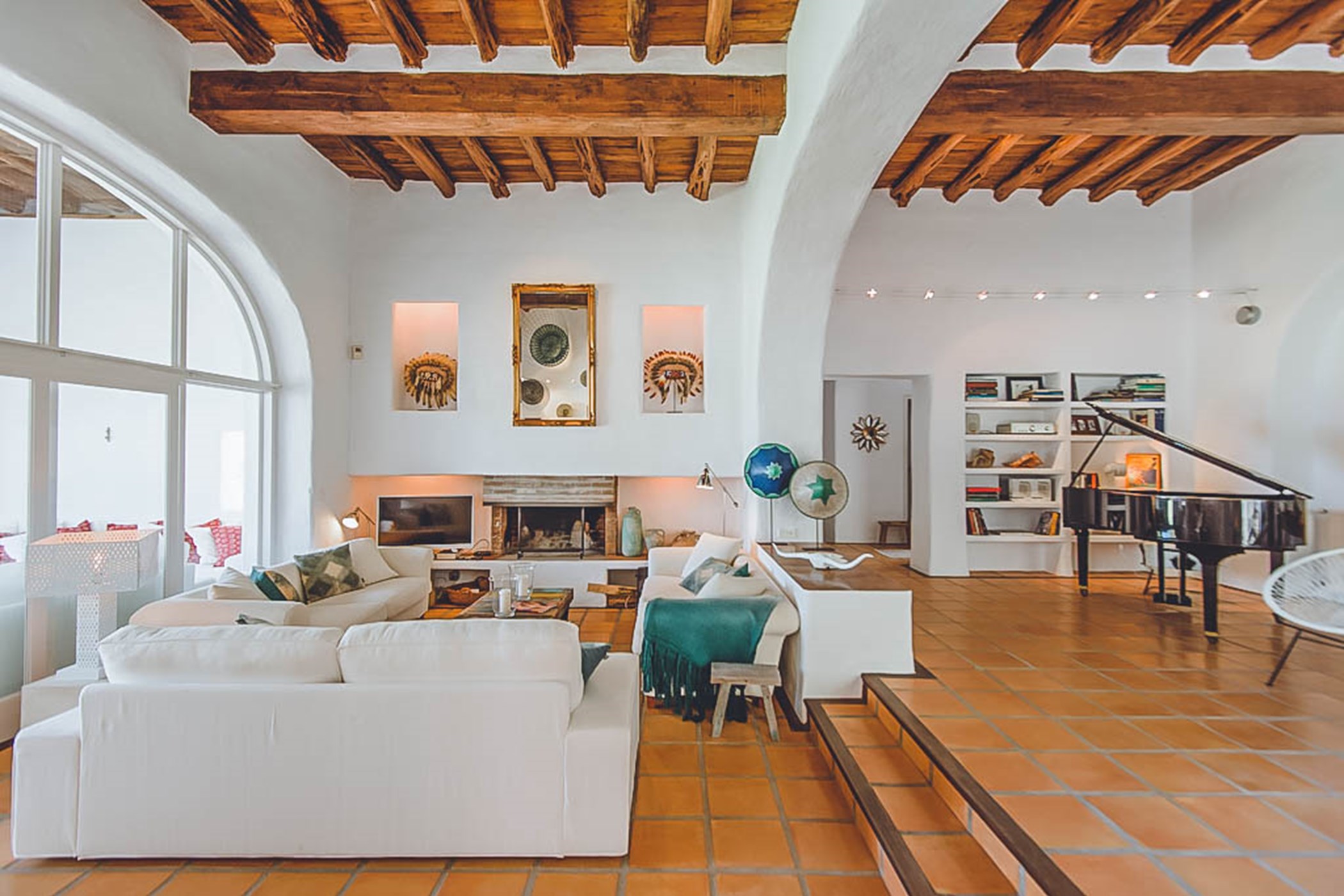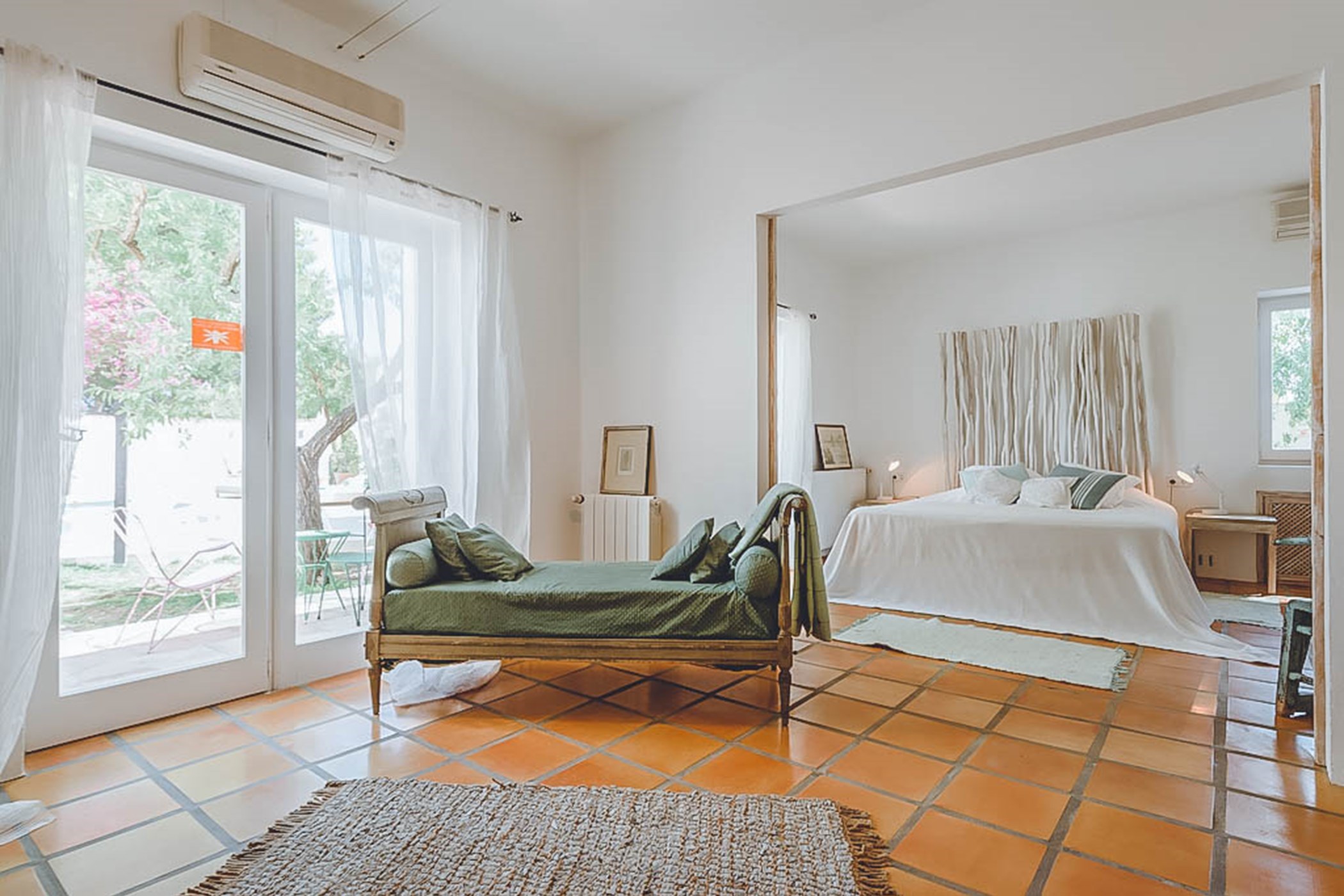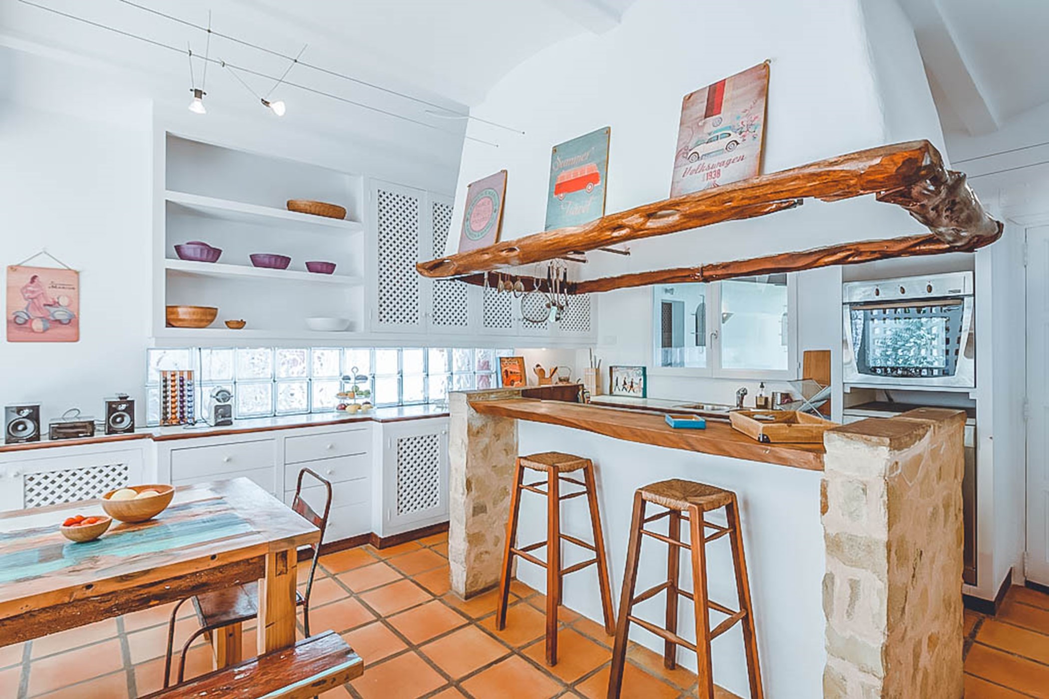 Step into the beautiful and spacious living areas of Can Sandra, where contemporary bohemian style meets rustic charm. The large open-plan lounge and fully equipped kitchen feature high wooden sabina beamed ceilings and a comfortable sofa area. French doors open onto an outside porch with a grand-sized exterior dining table, creating the perfect spot to enjoy meals while embracing the tranquil surroundings.