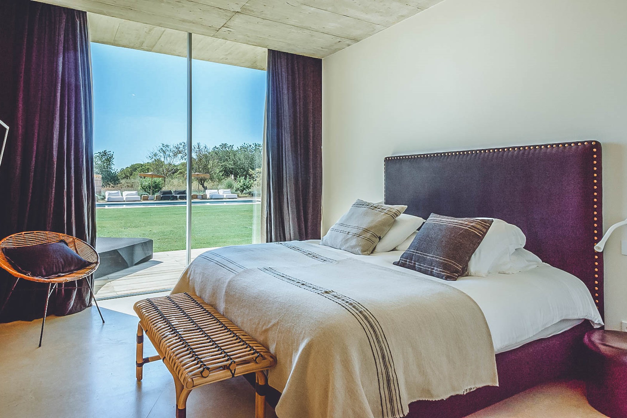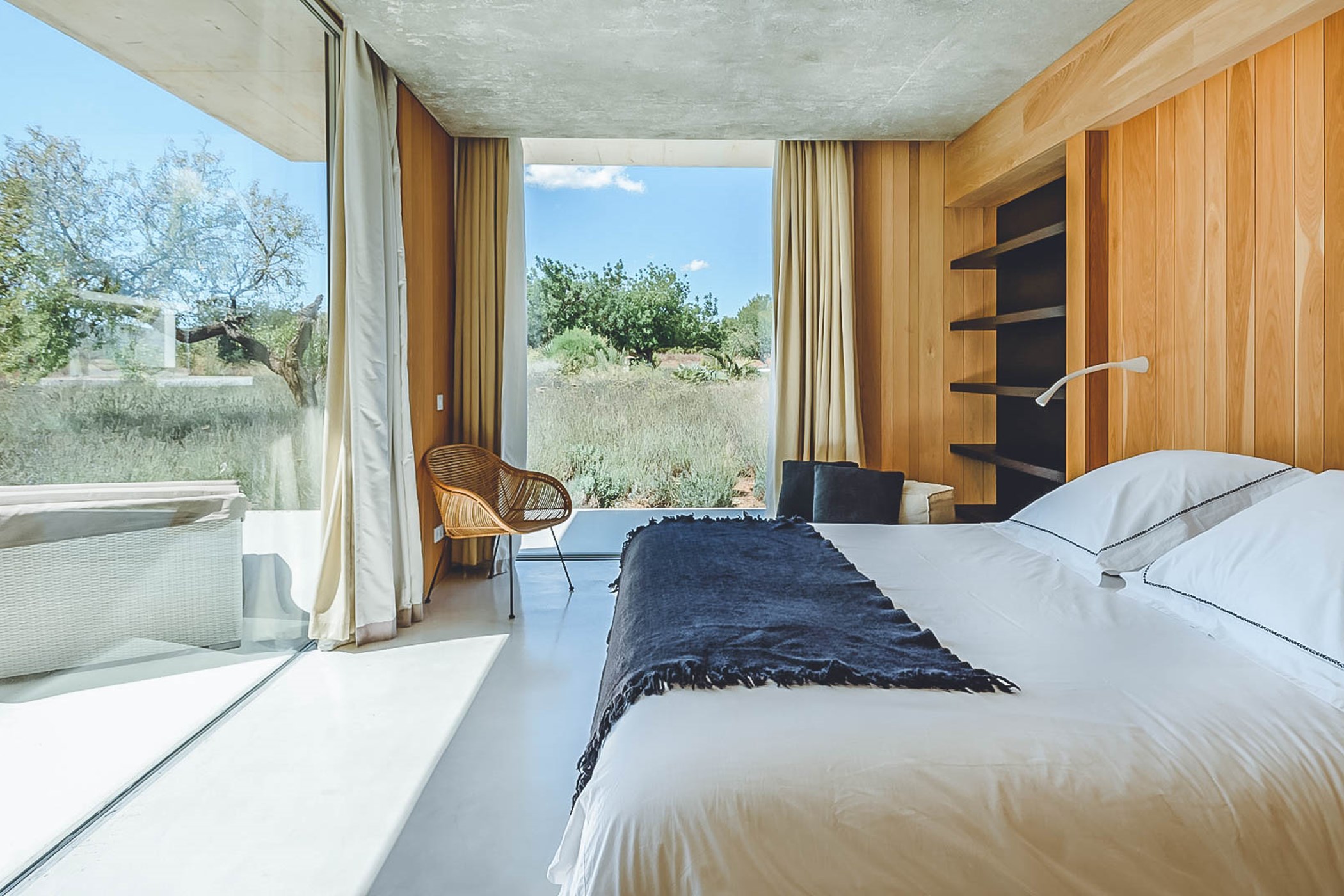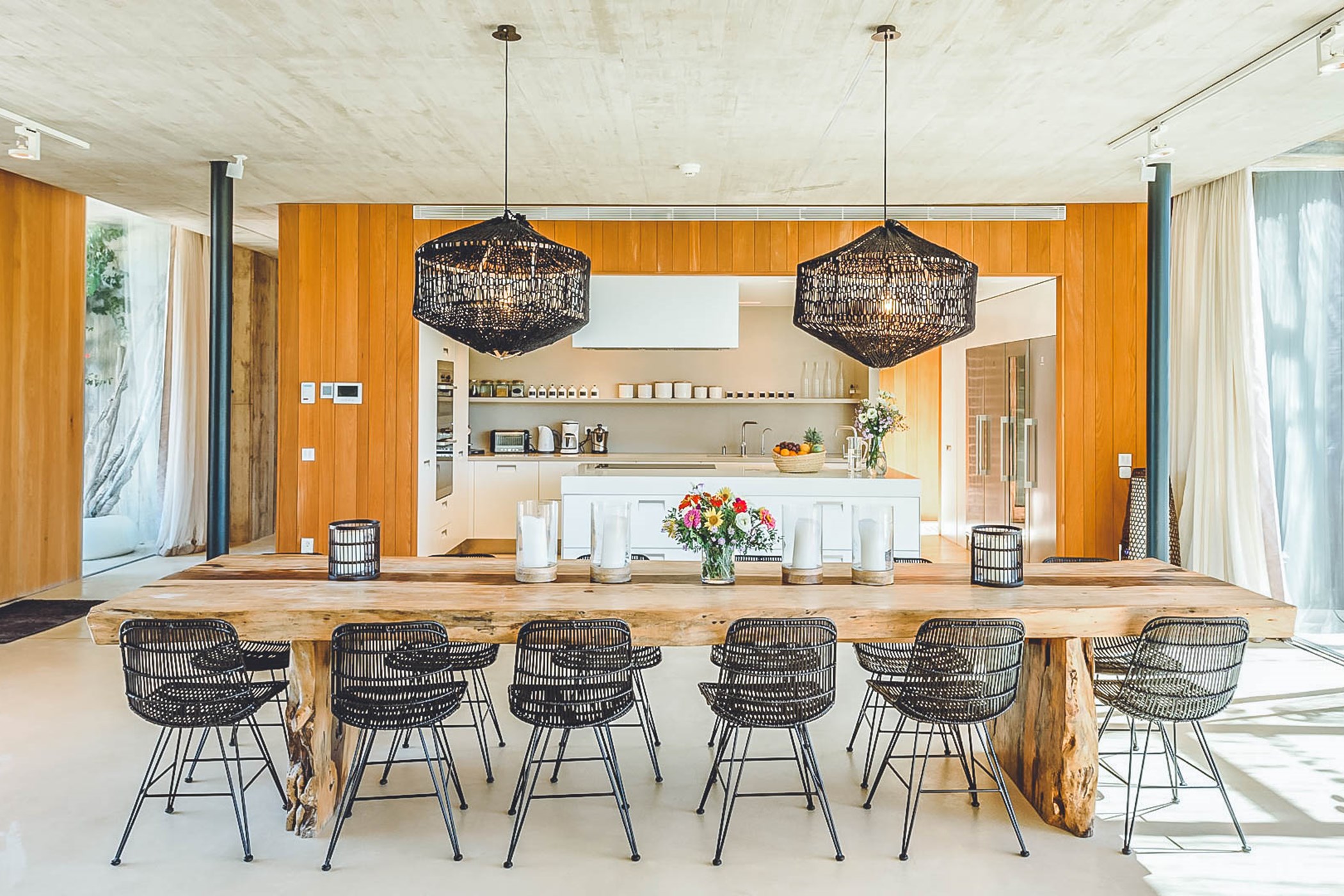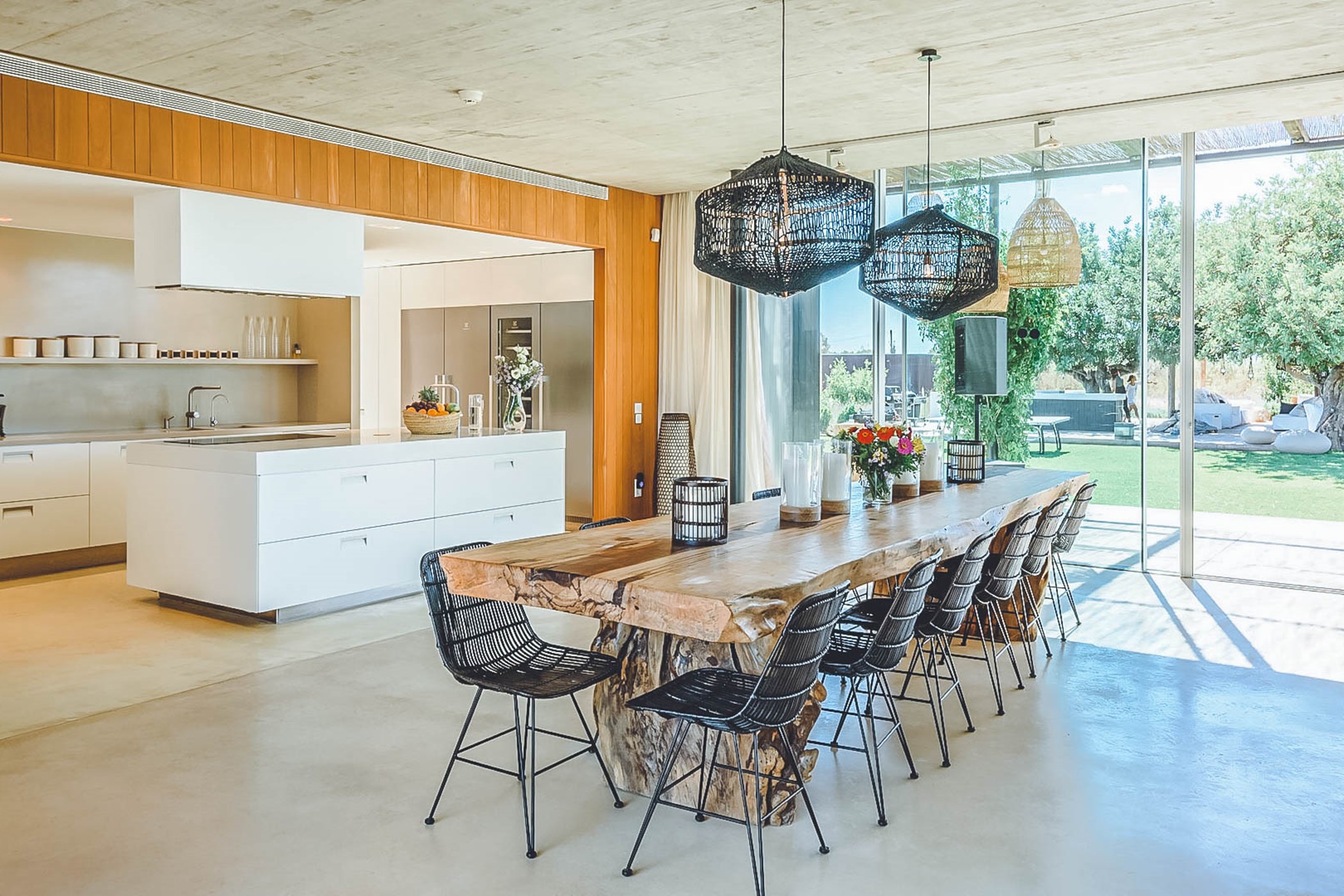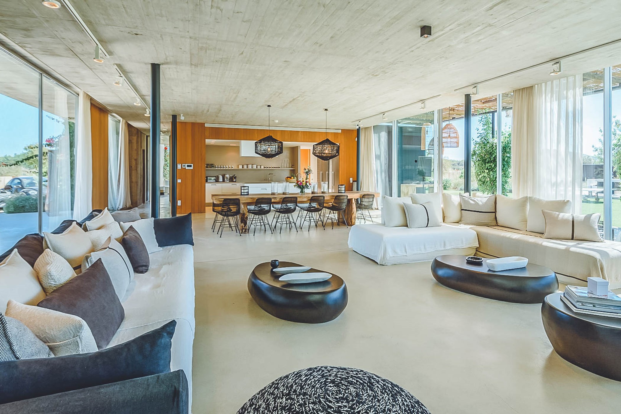 Glass windows throughout the villa bring the beauty of nature indoors, while the flat verdant lawns provide a lush green backdrop. The spacious interiors, designed by the French owner, reflect a bohemian chic style with a mix of concrete floors, warm Scandi wood, and accents of smudgy black charcoal. The open-plan living room, kitchen, and dining area exude a light and airy ambiance, thanks to the large windows that run the length of the room. Black columns add an edgy industrial touch, while the creamy beige concrete floor and ceiling create a sense of warmth. Sink into the sumptuous seats and gather around the large reclaimed wooden table for memorable gatherings.