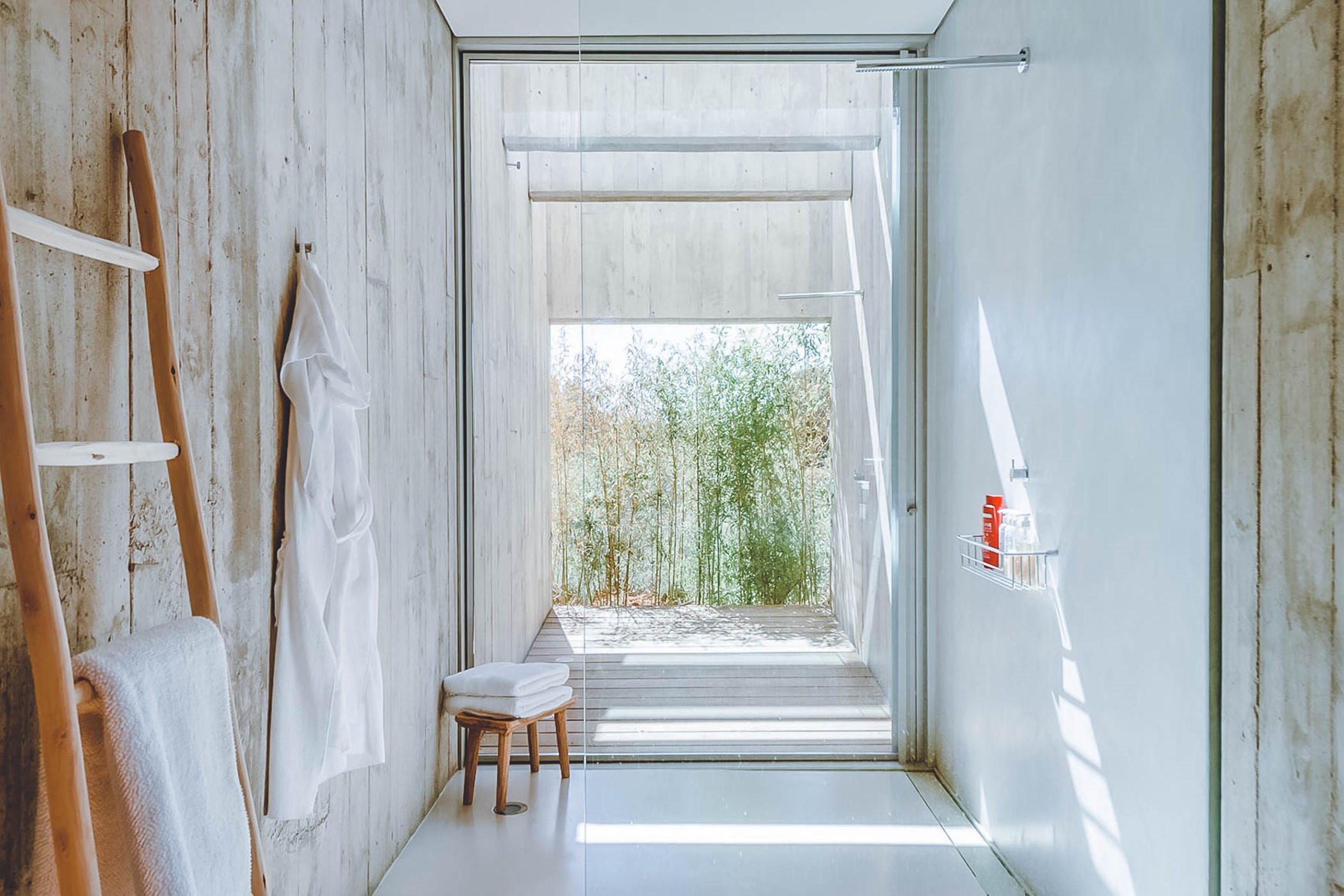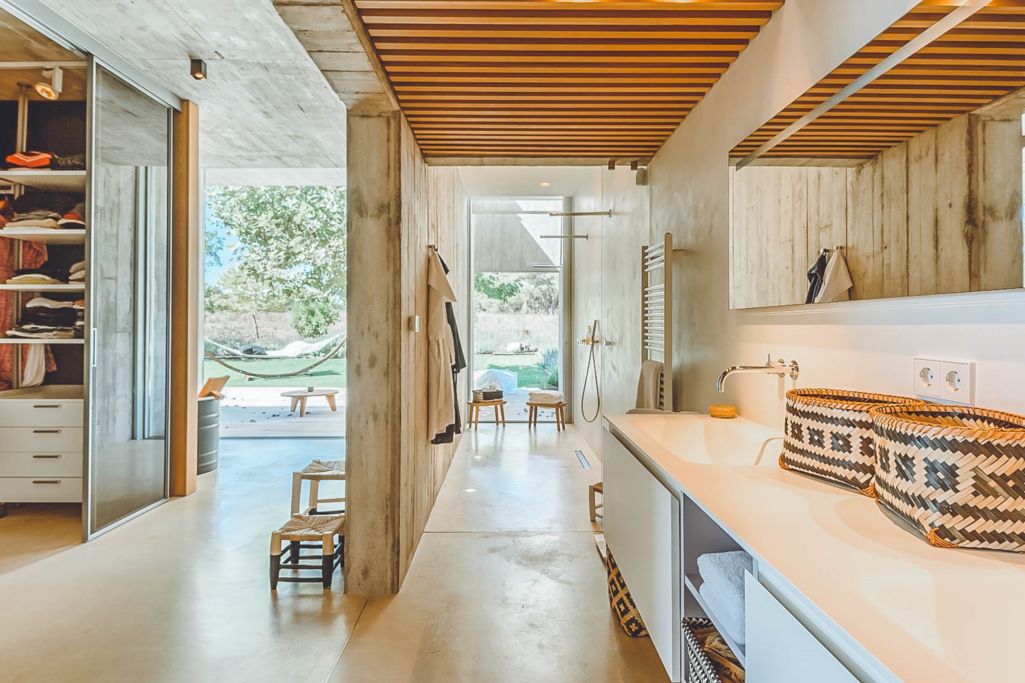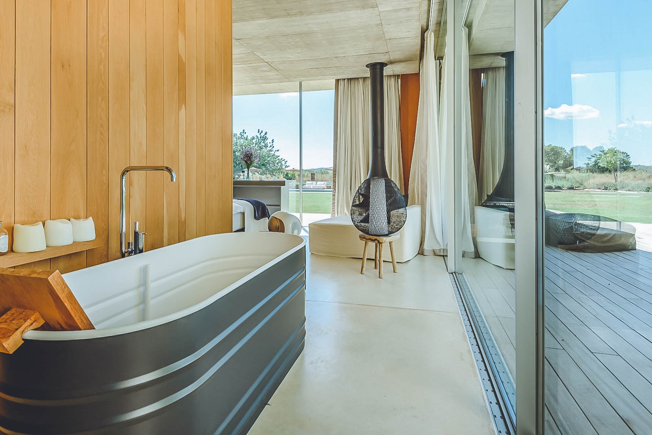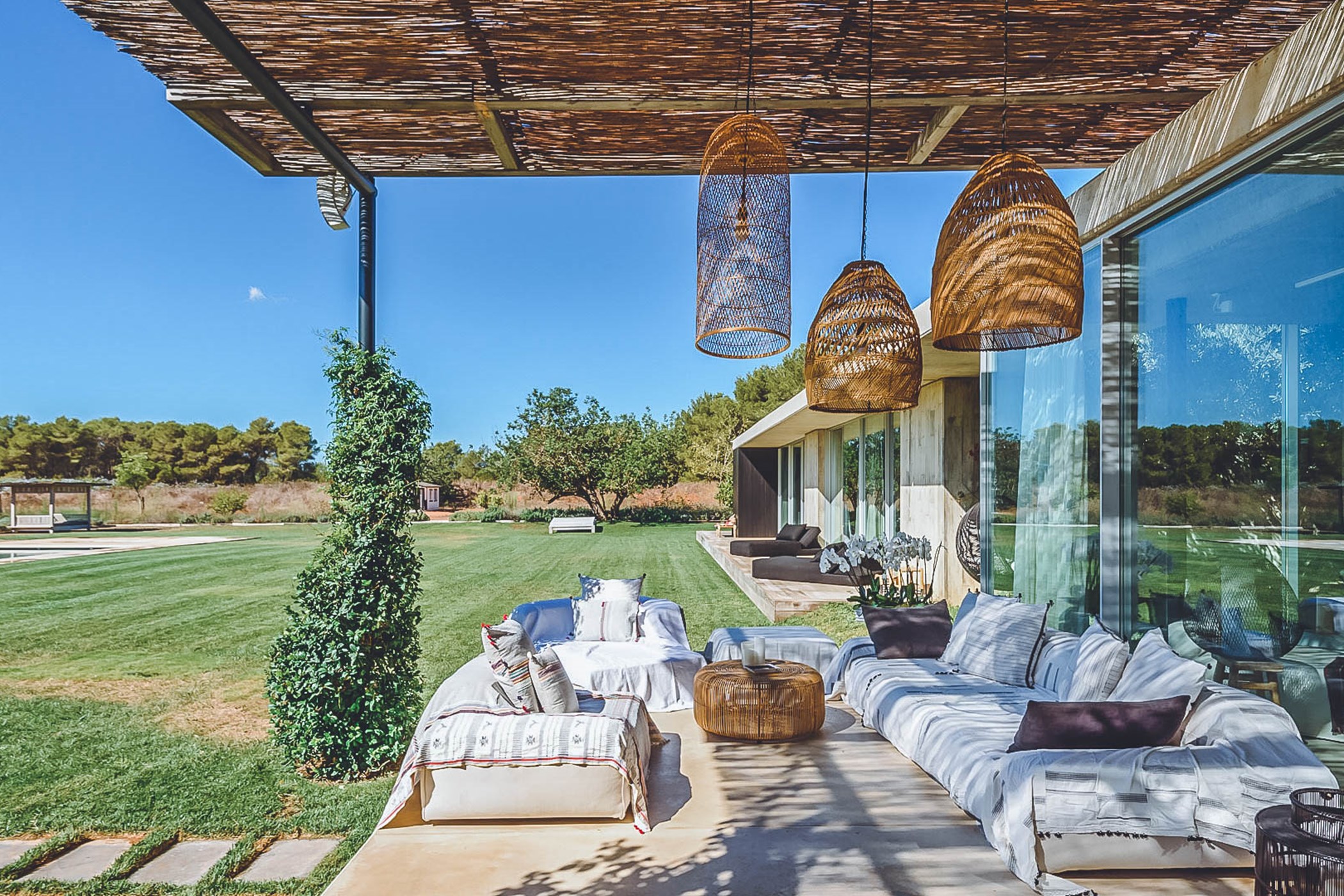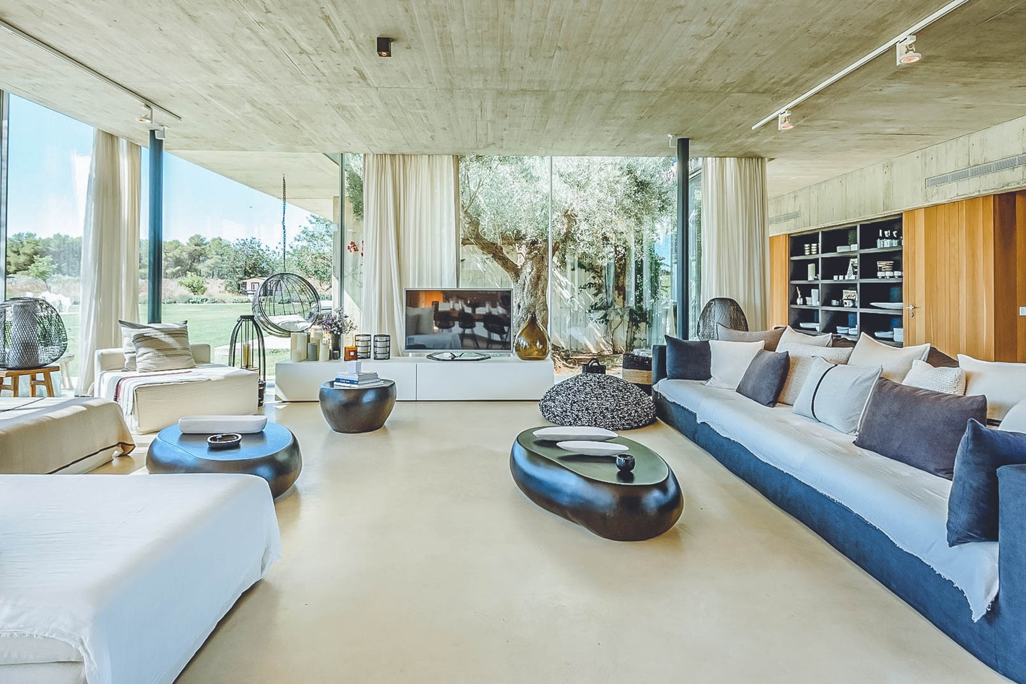 Glass windows throughout the villa bring the beauty of nature indoors, while the flat verdant lawns provide a lush green backdrop. The spacious interiors, designed by the French owner, reflect a bohemian chic style with a mix of concrete floors, warm Scandi wood, and accents of smudgy black charcoal. The open-plan living room, kitchen, and dining area exude a light and airy ambiance, thanks to the large windows that run the length of the room. Black columns add an edgy industrial touch, while the creamy beige concrete floor and ceiling create a sense of warmth. Sink into the sumptuous seats and gather around the large reclaimed wooden table for memorable gatherings.