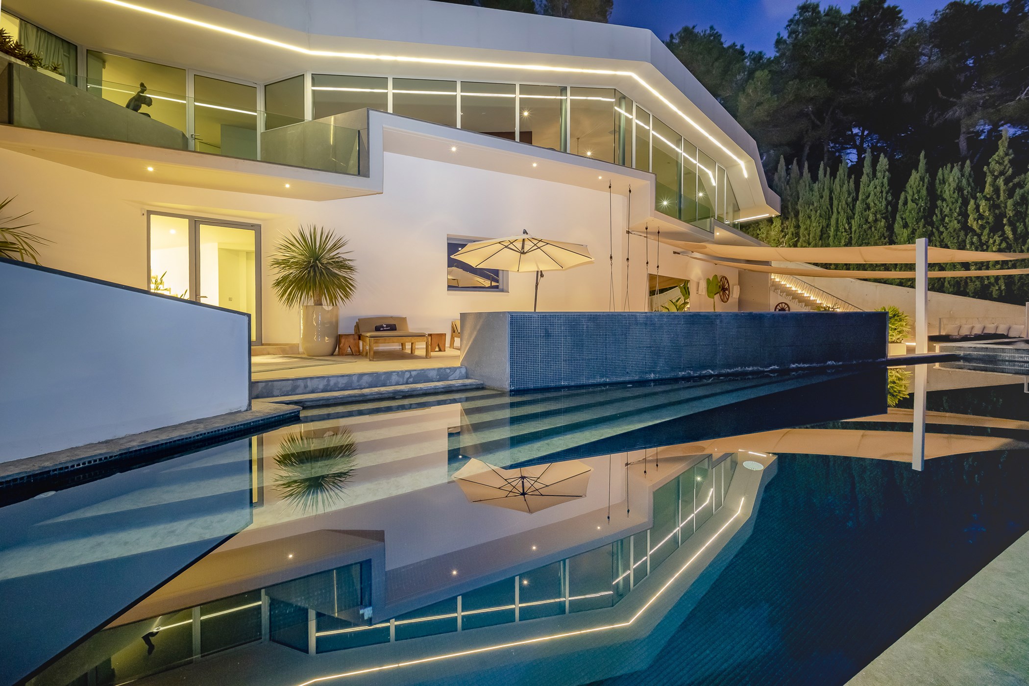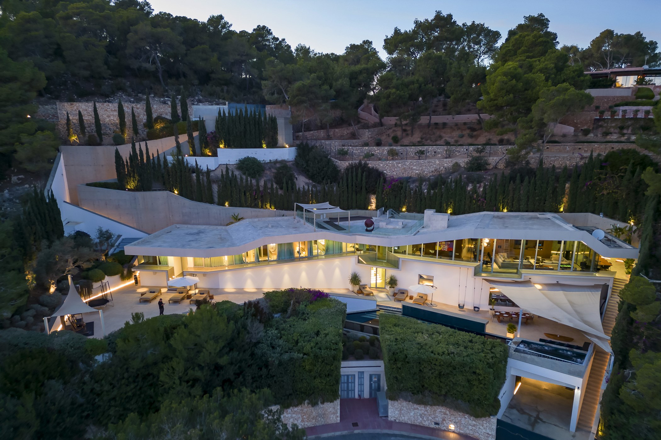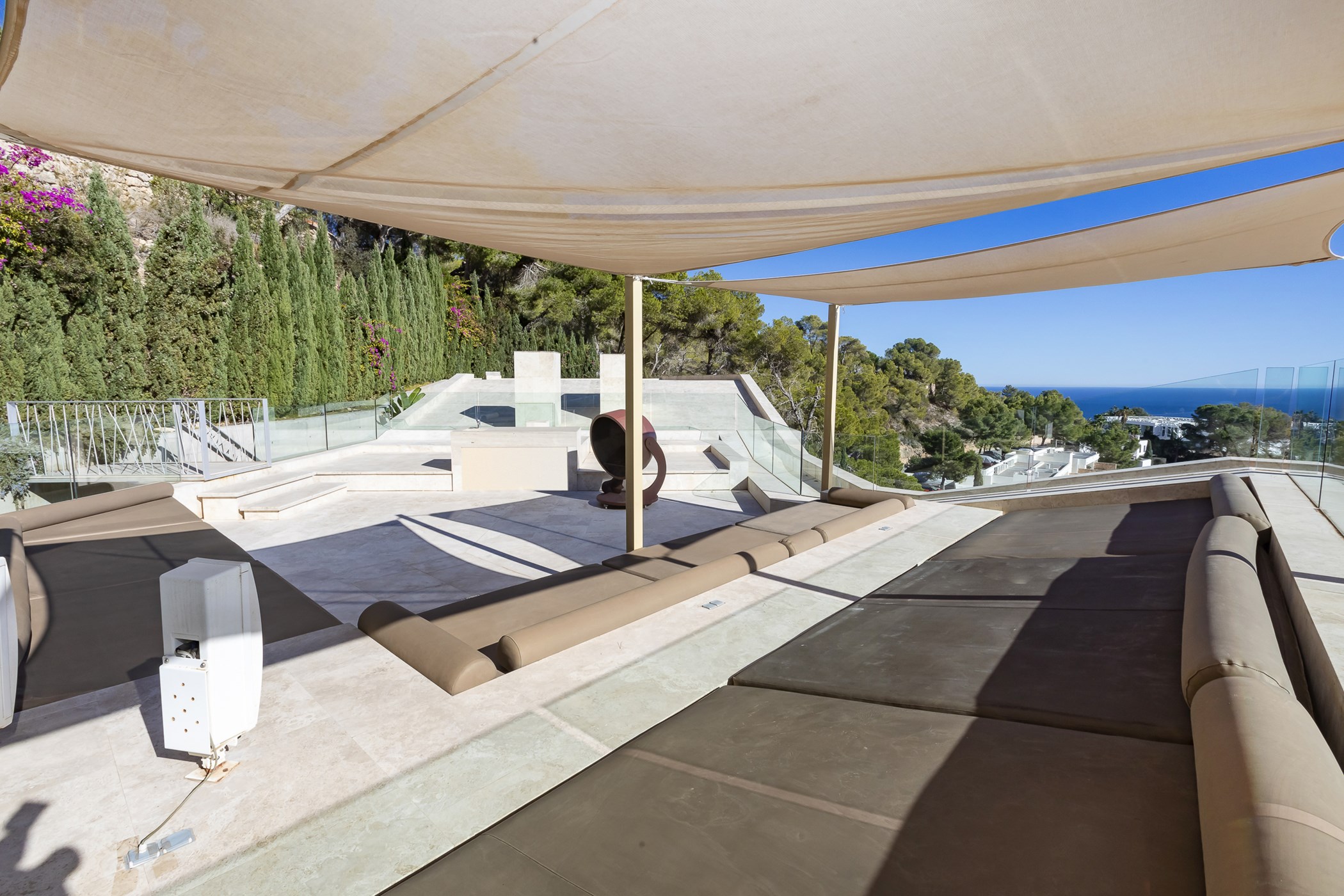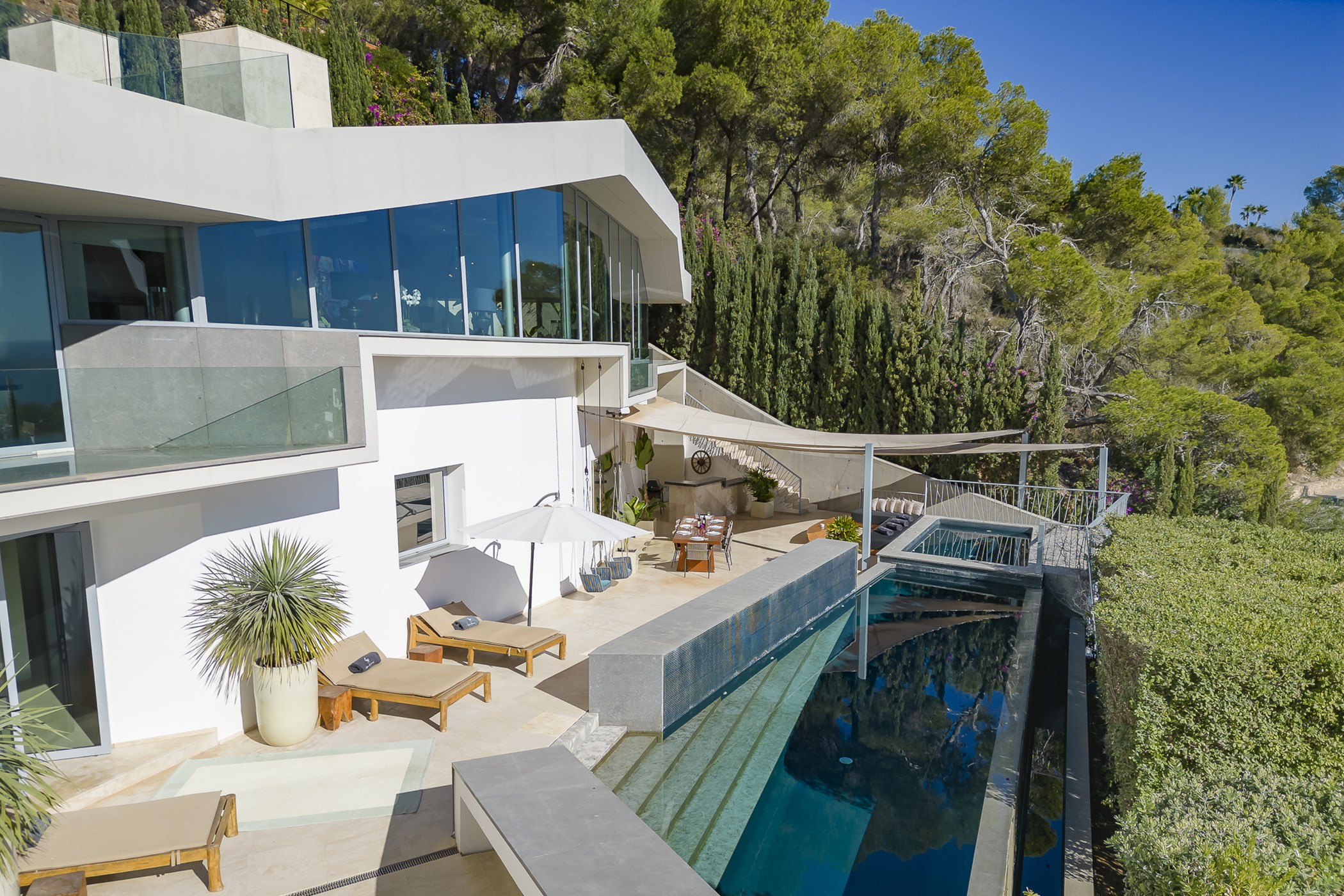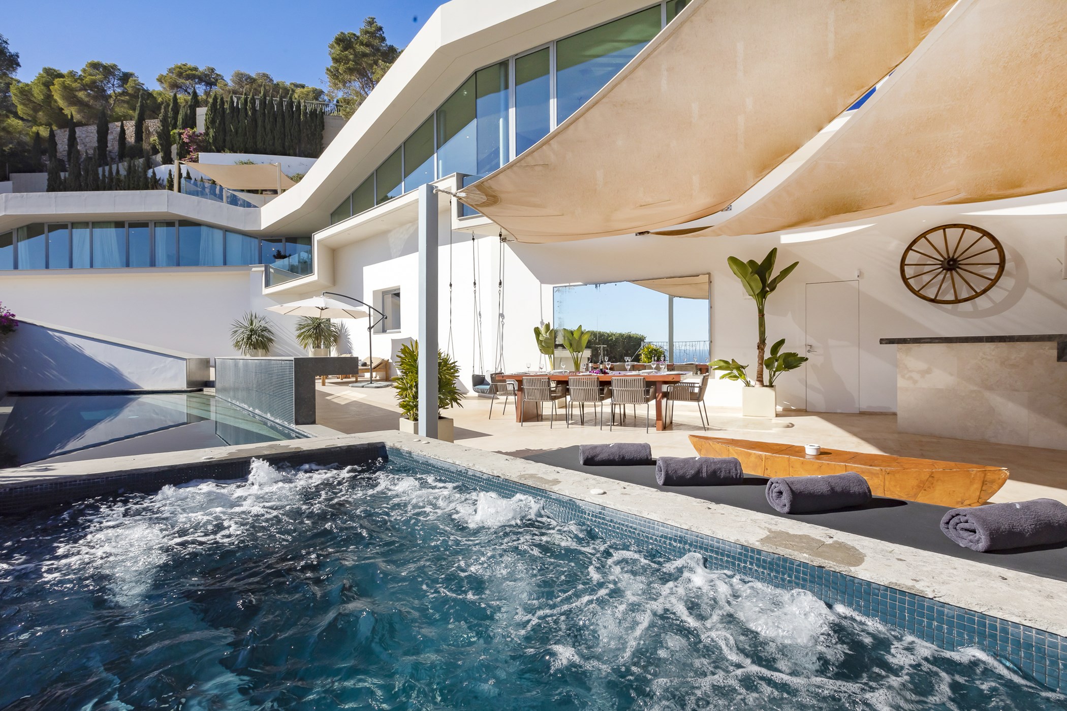 Step outside onto one of the many elegant terraces surrounding the large infinity pool, where guests can relax and bask in the Ibizan sun. The villa also boasts a fabulous chill-out area on the roof terrace, BBQ facilities, hot tub, mood lighting system, and a Bose sound system, providing the perfect setting for outdoor gatherings and alfresco dining experiences.