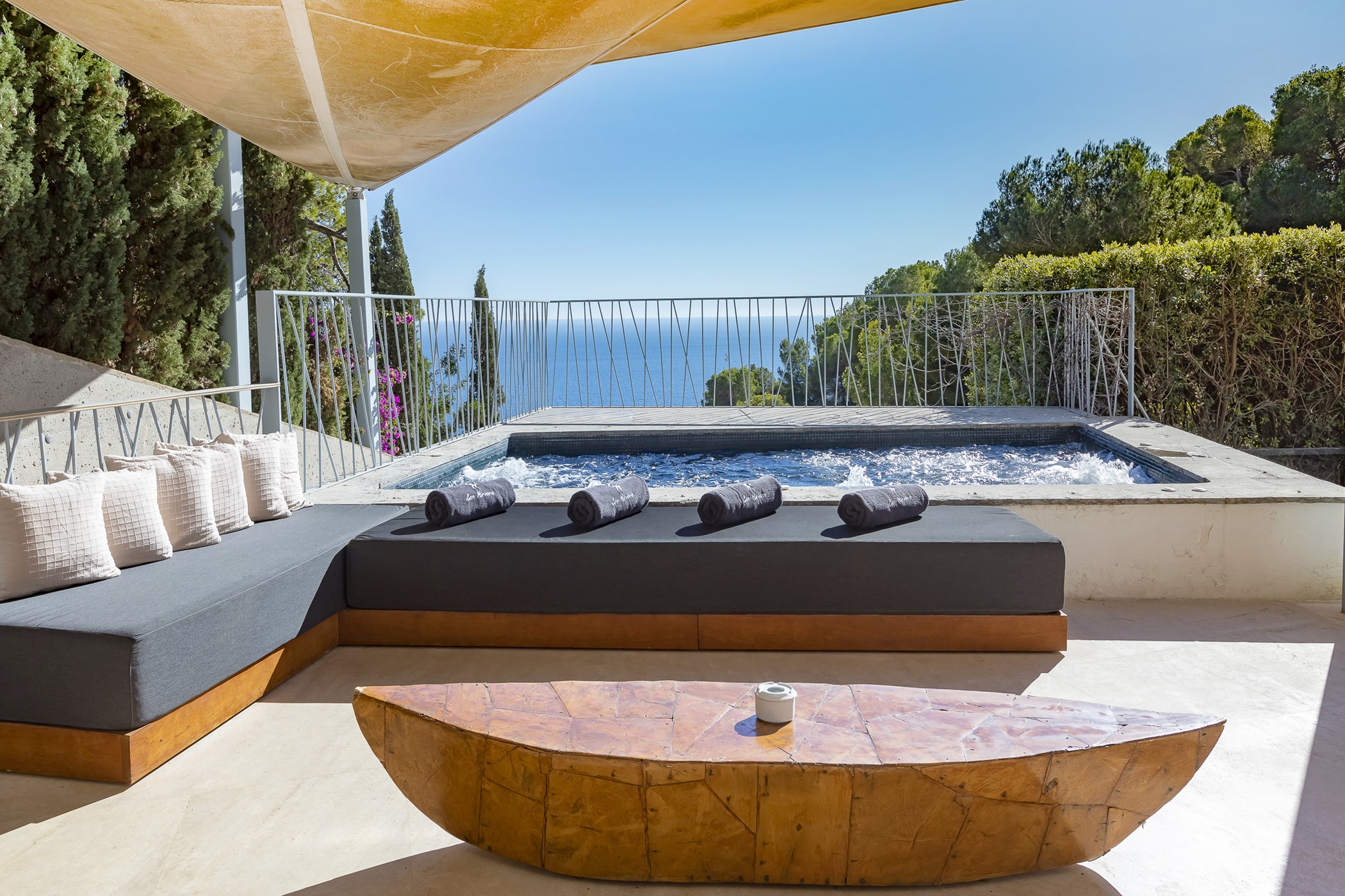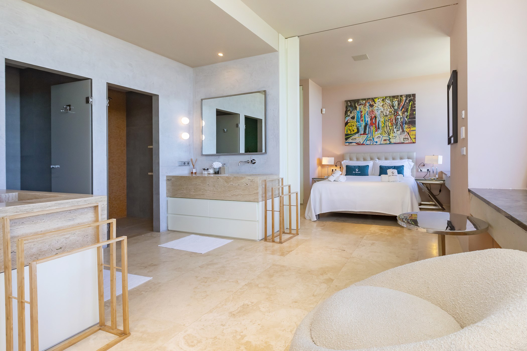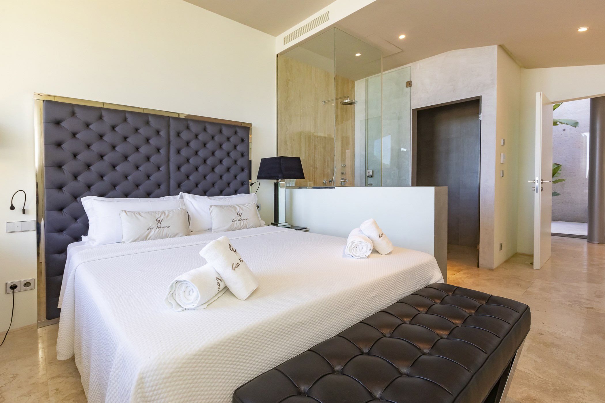 Each of the five bedroom suites at Villa Estelle is decorated in a sophisticated and sleek style, featuring fresh white linens and ensuite bathrooms. Three of the five bedrooms offer mesmerizing sea views, ensuring a tranquil and serene stay for all guests.