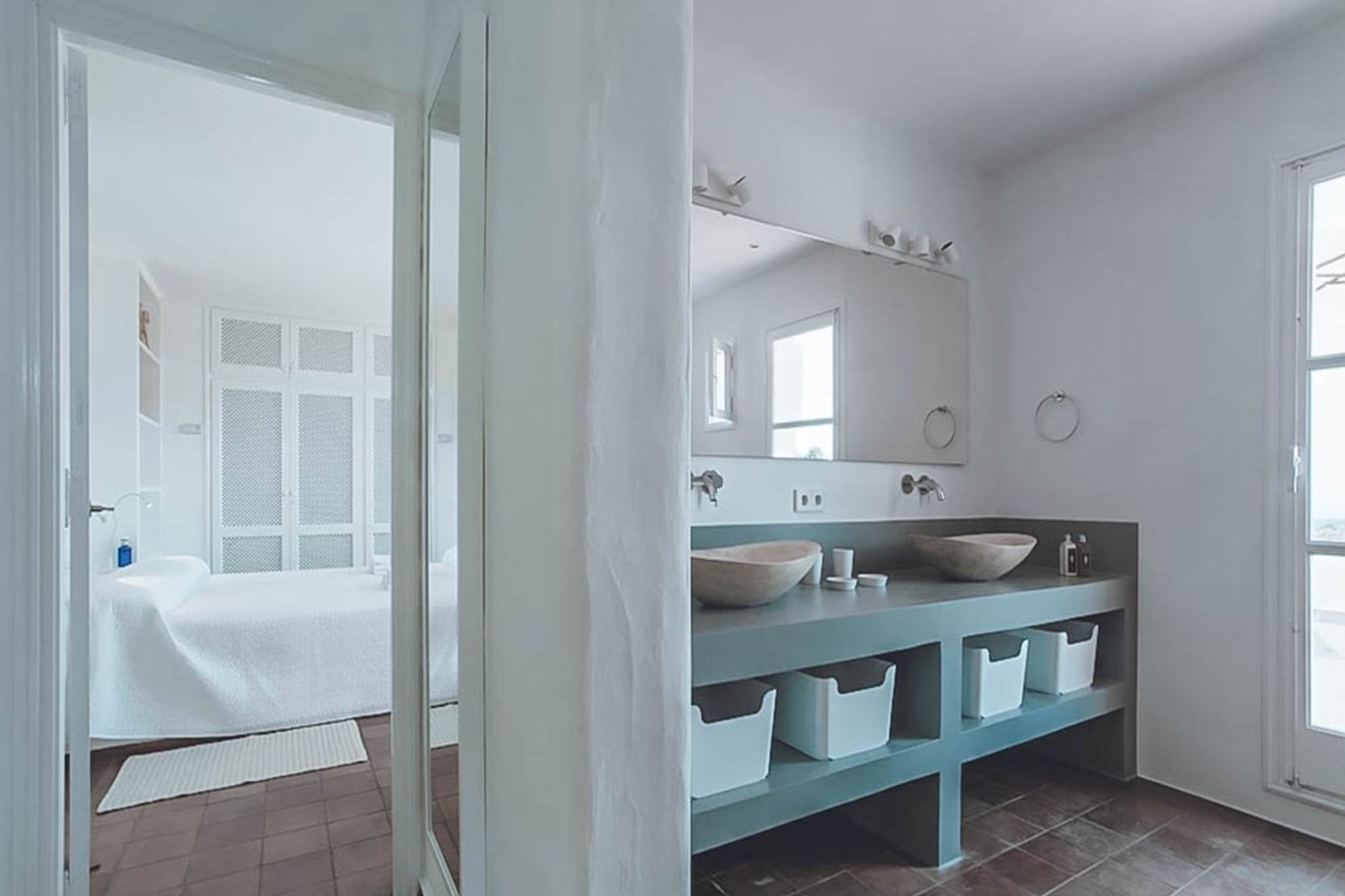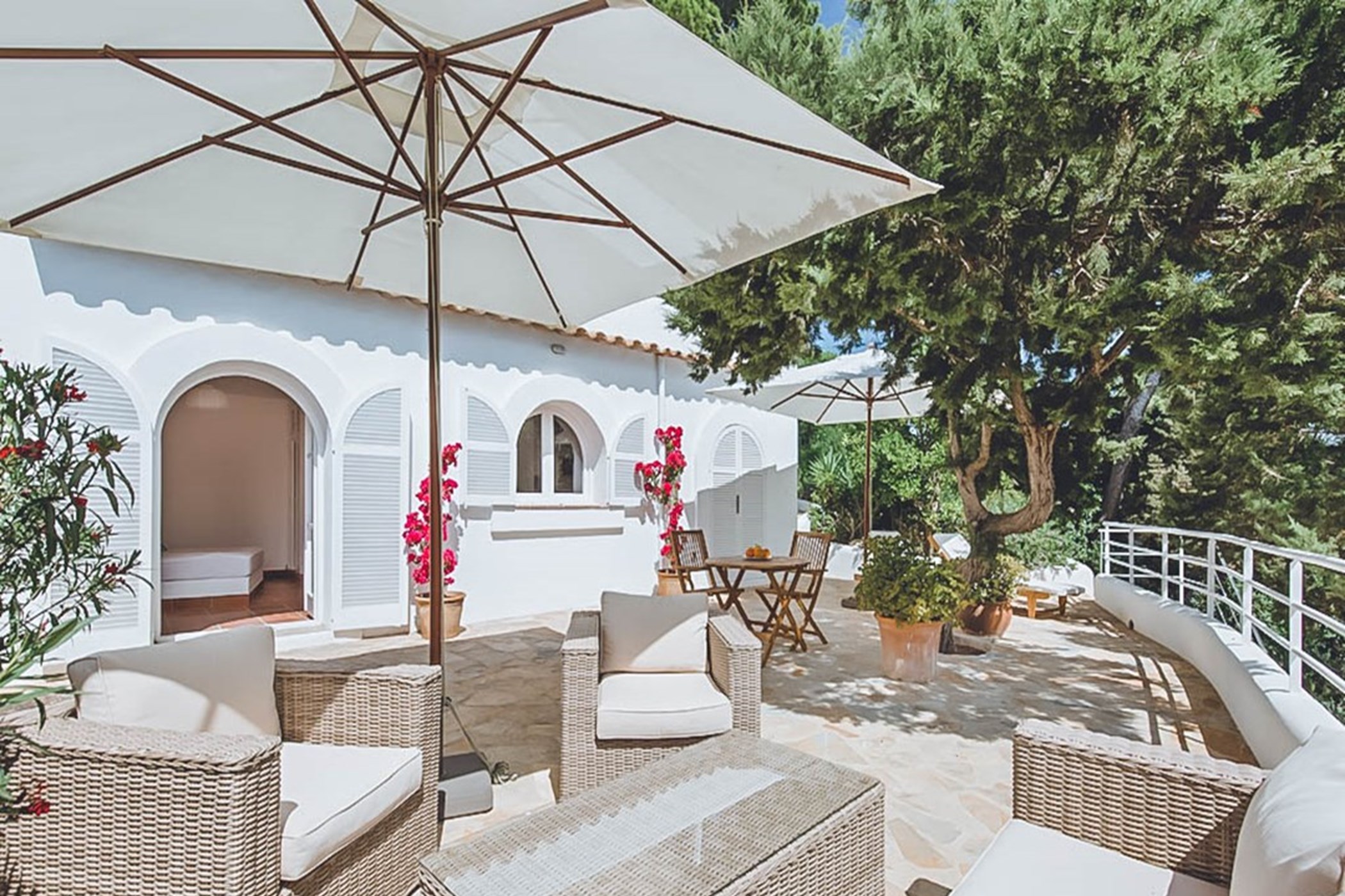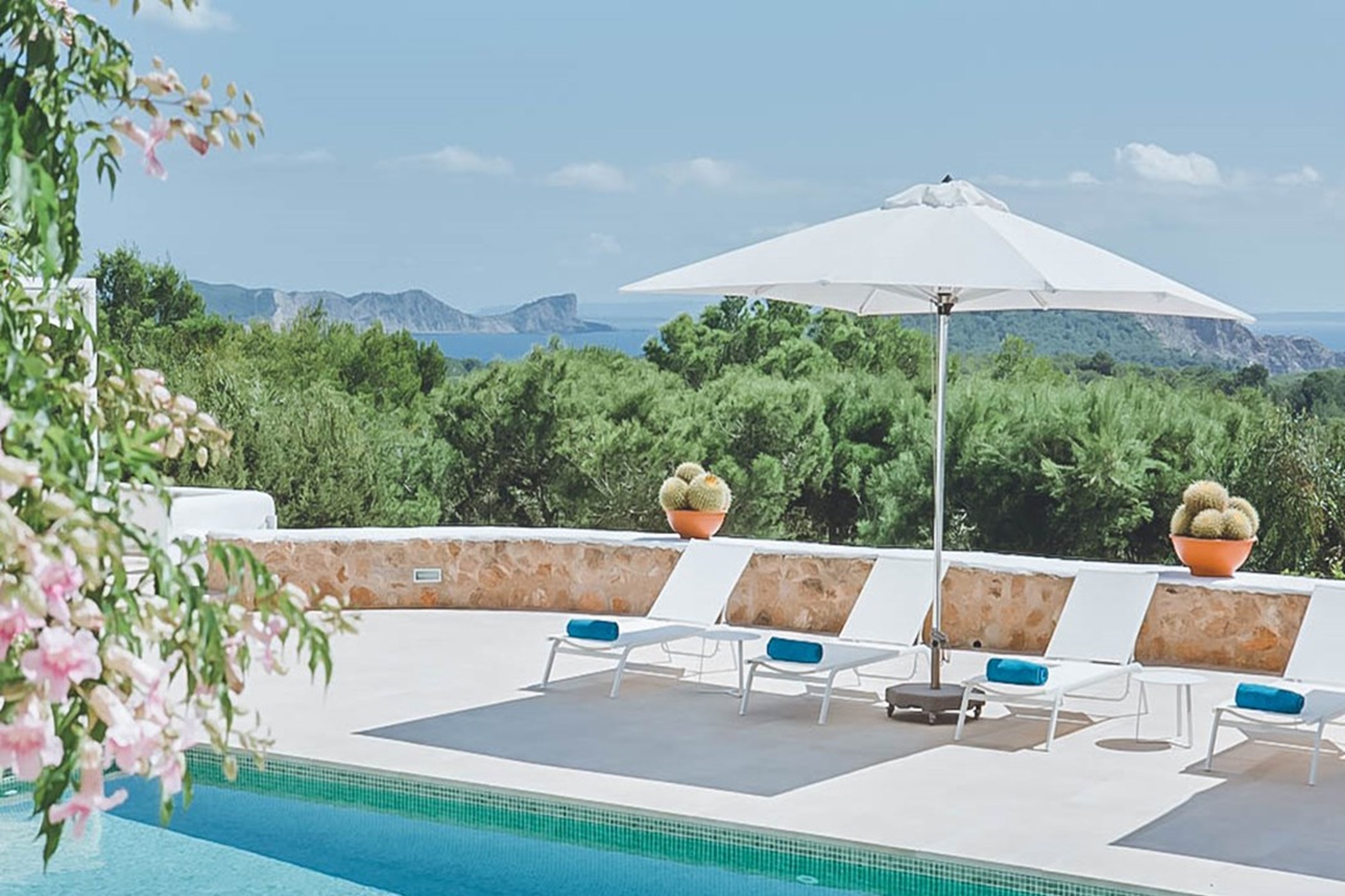 The two master suites at this villa are generous and versatile, each with private terraces allowing guests to fully immerse themselves in the sea views and bask in the Ibizan sun with added privacy. One bedroom even features its own kitchenette and ensuite bathroom. Every bedroom has been carefully styled to complement the theme of the main house.