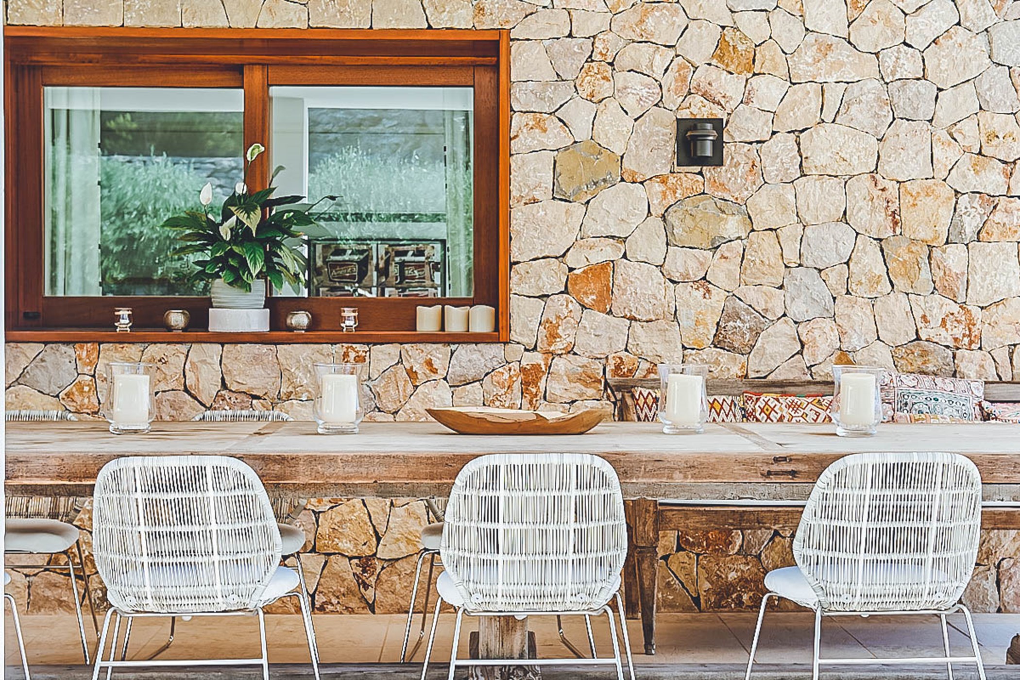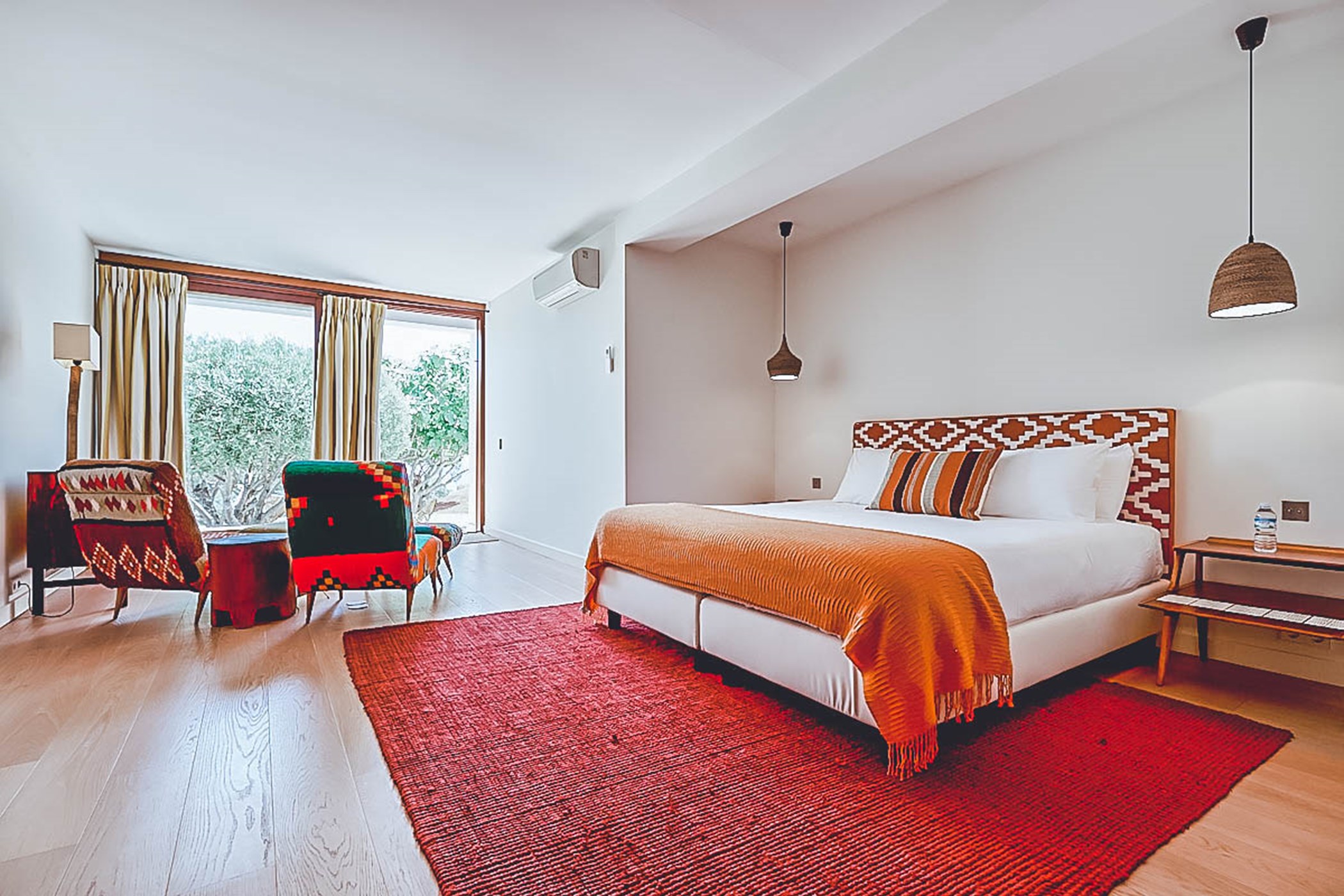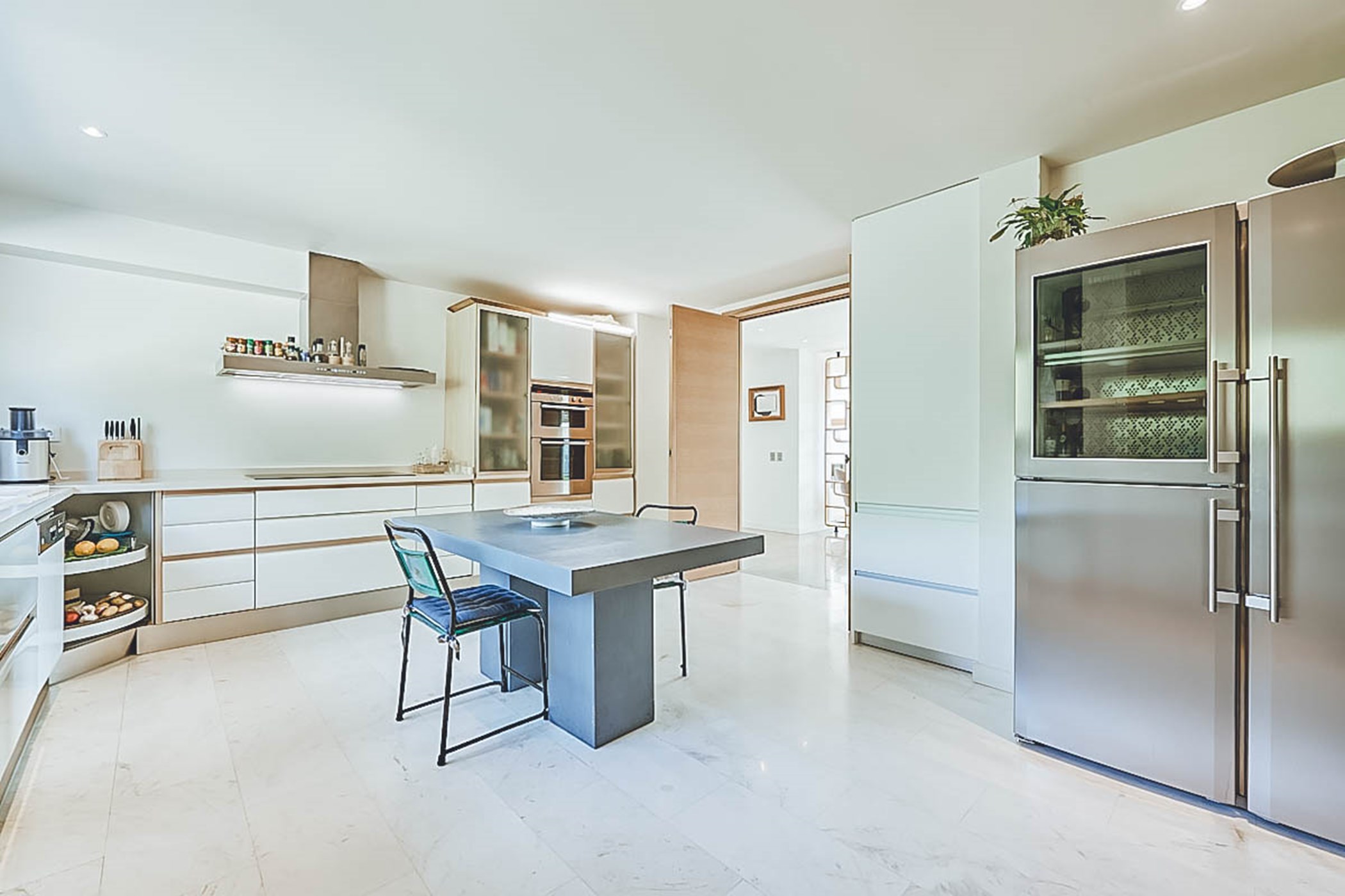 Step into the living areas of Villa Judith and be greeted by an abundance of natural sunlight streaming through the floor-to-ceiling windows. The large, open-plan living room is divided over two levels and features inviting sofas, luxurious fittings, and tasteful artwork, creating an air of style and sophistication throughout. The unique furniture, with its retro 50's and 70's vintage style, perfectly complements the modern architecture. The fully equipped kitchen seamlessly integrates into the open plan living area, making it a perfect space for socializing and entertaining.