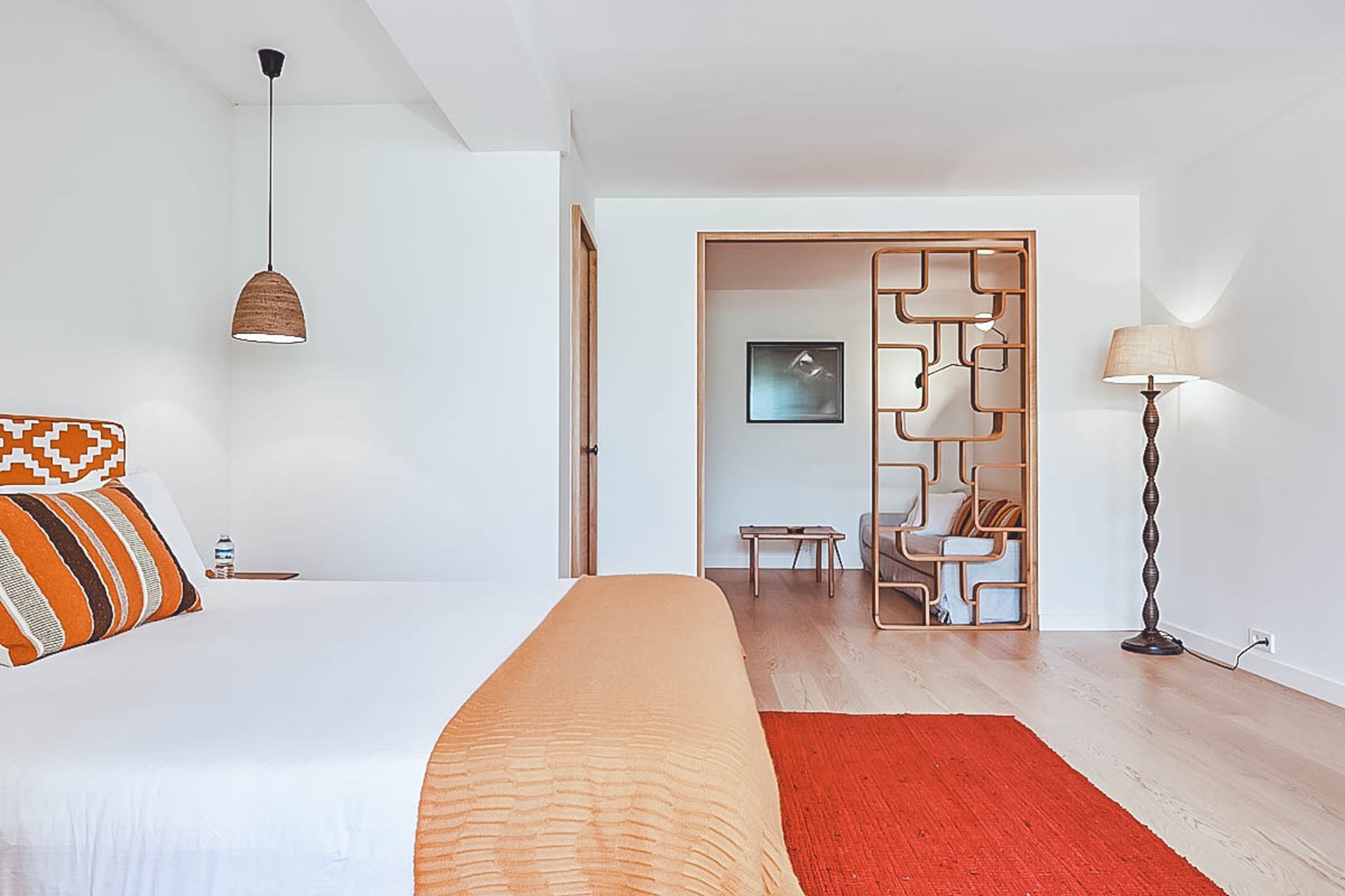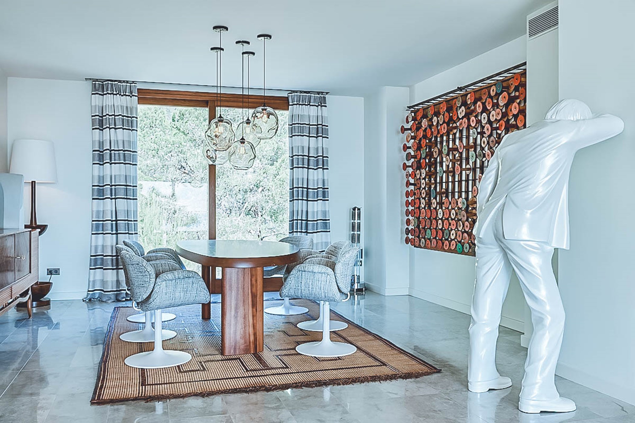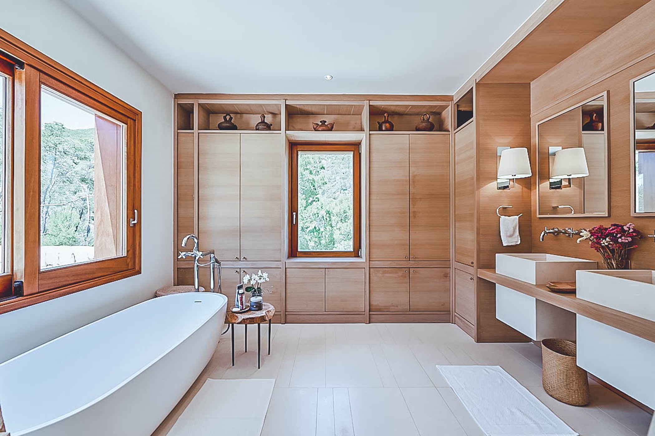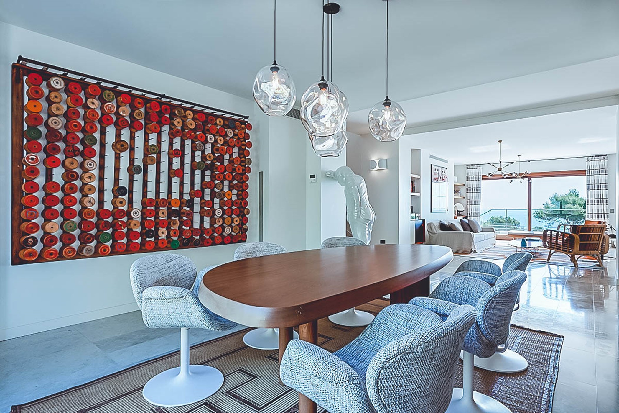 Step into the living areas of Villa Judith and be greeted by an abundance of natural sunlight streaming through the floor-to-ceiling windows. The large, open-plan living room is divided over two levels and features inviting sofas, luxurious fittings, and tasteful artwork, creating an air of style and sophistication throughout. The unique furniture, with its retro 50's and 70's vintage style, perfectly complements the modern architecture. The fully equipped kitchen seamlessly integrates into the open plan living area, making it a perfect space for socializing and entertaining.