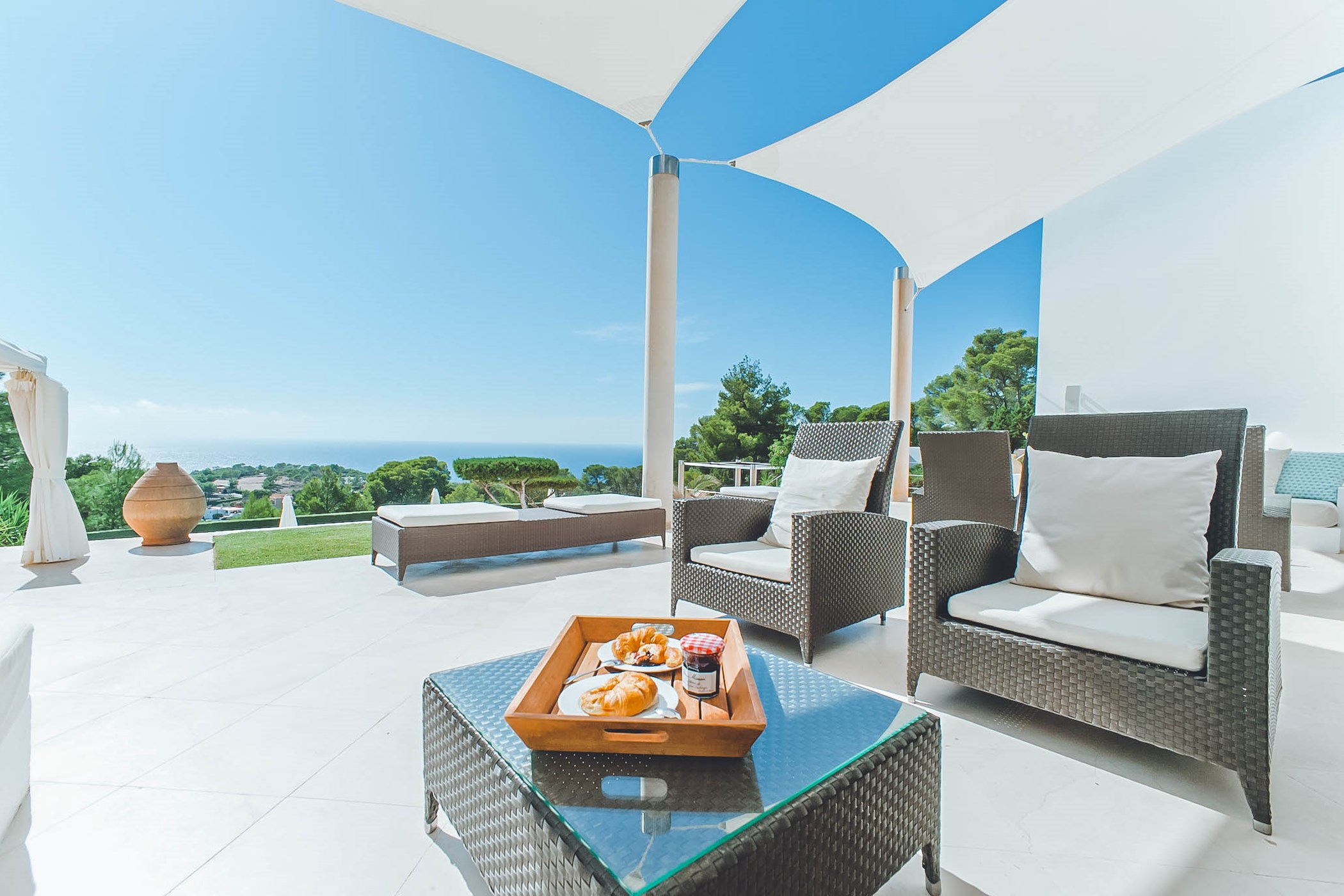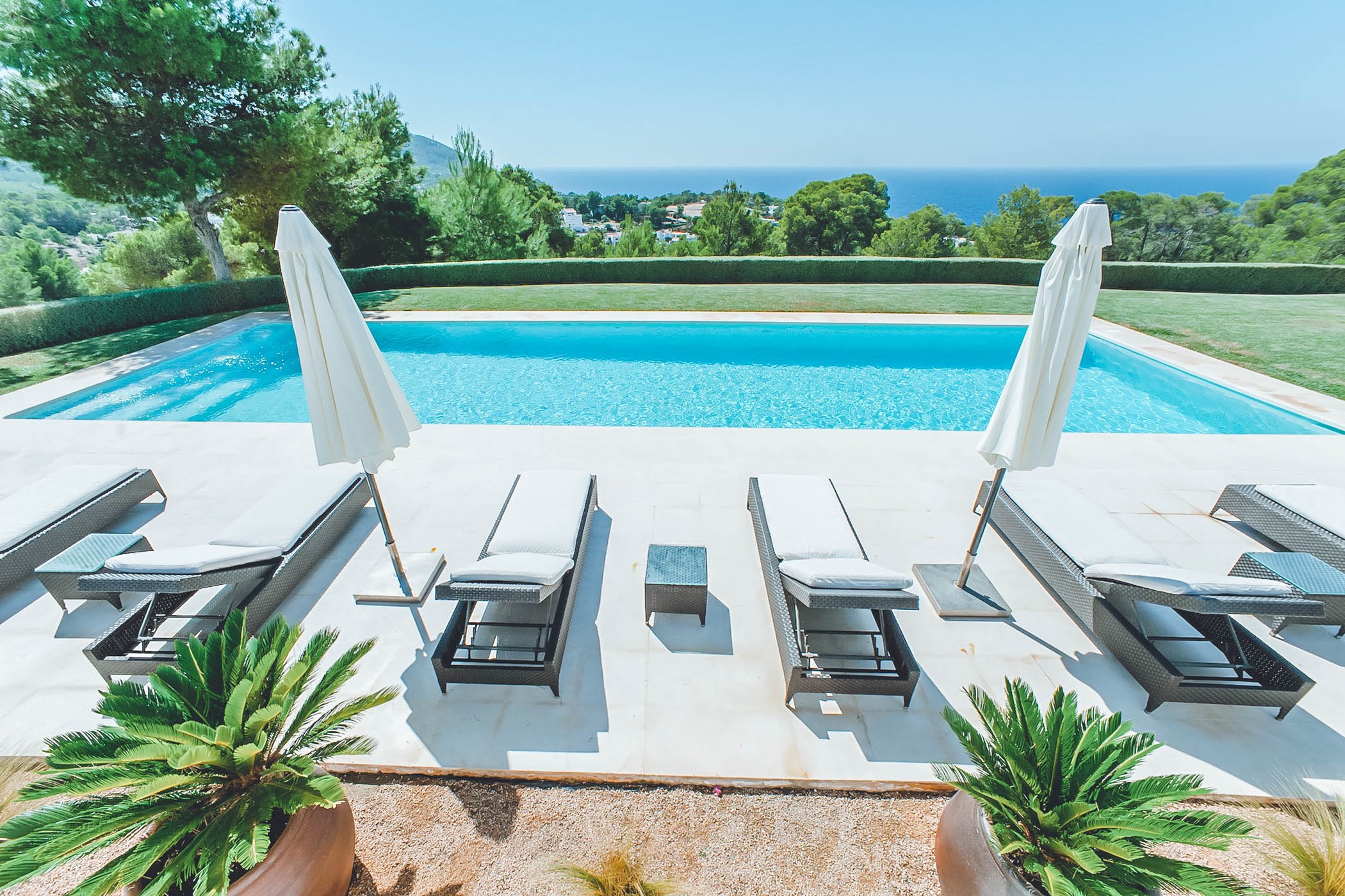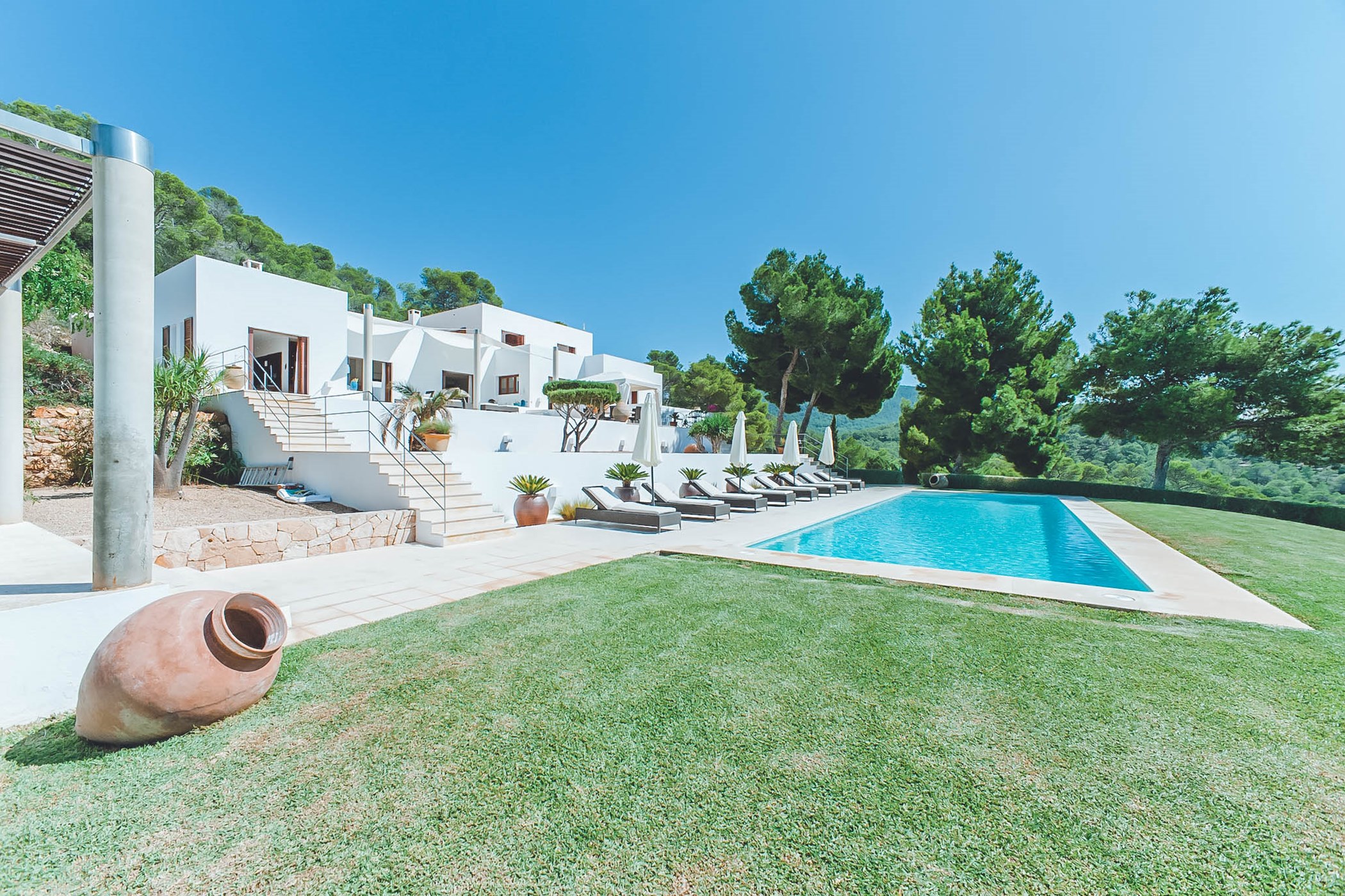 The grounds of Villa Katherine showcase lush, well-maintained gardens and a splendid swimming pool surrounded by luxurious sun loungers, offering the perfect vantage point to witness Ibiza's renowned sunsets with friends and family. The spacious terrace includes a chic chill-out area and shaded dining space for al-fresco meals.