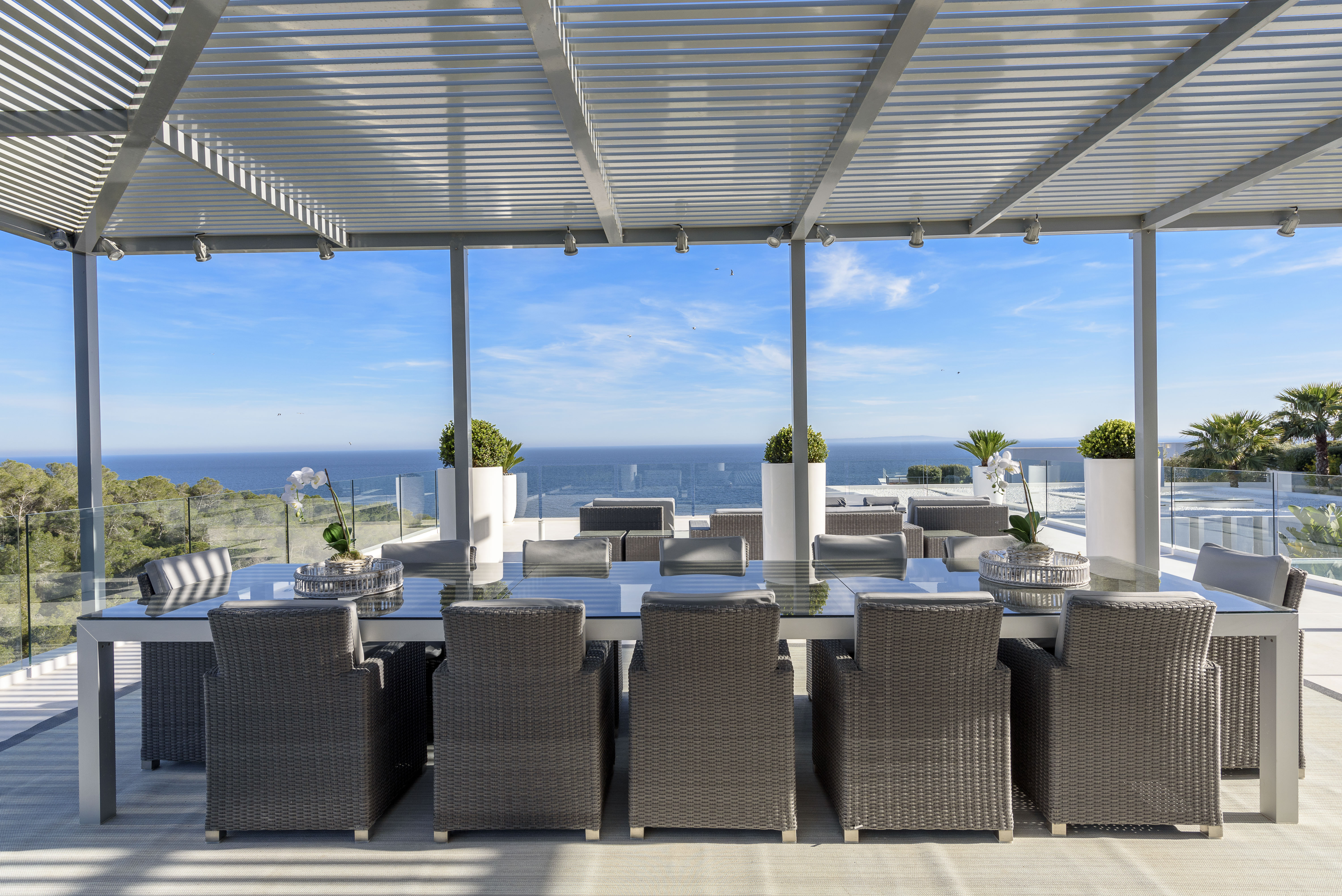 This magnificent 8 bedroom property located in Cap Martinet, close by to the very stylish Marina Botafoch and within minutes to many of Ibiza’s most exclusive bars and restaurants. Hidden among beautifully maintained gardens, this home offers vast outdoor terraces featuring a beautiful infinity pool and jacuzzi with fantastic views of the Mediterranean Sea and the surrounding countryside. The rooftop terrace offers comfortable outdoor sofa seating and a dining area – ideal for those entertaining and sunset cocktails. The exterior kitchen is fully fitted and perfect for alfresco dining while soaking up the incredible vistas