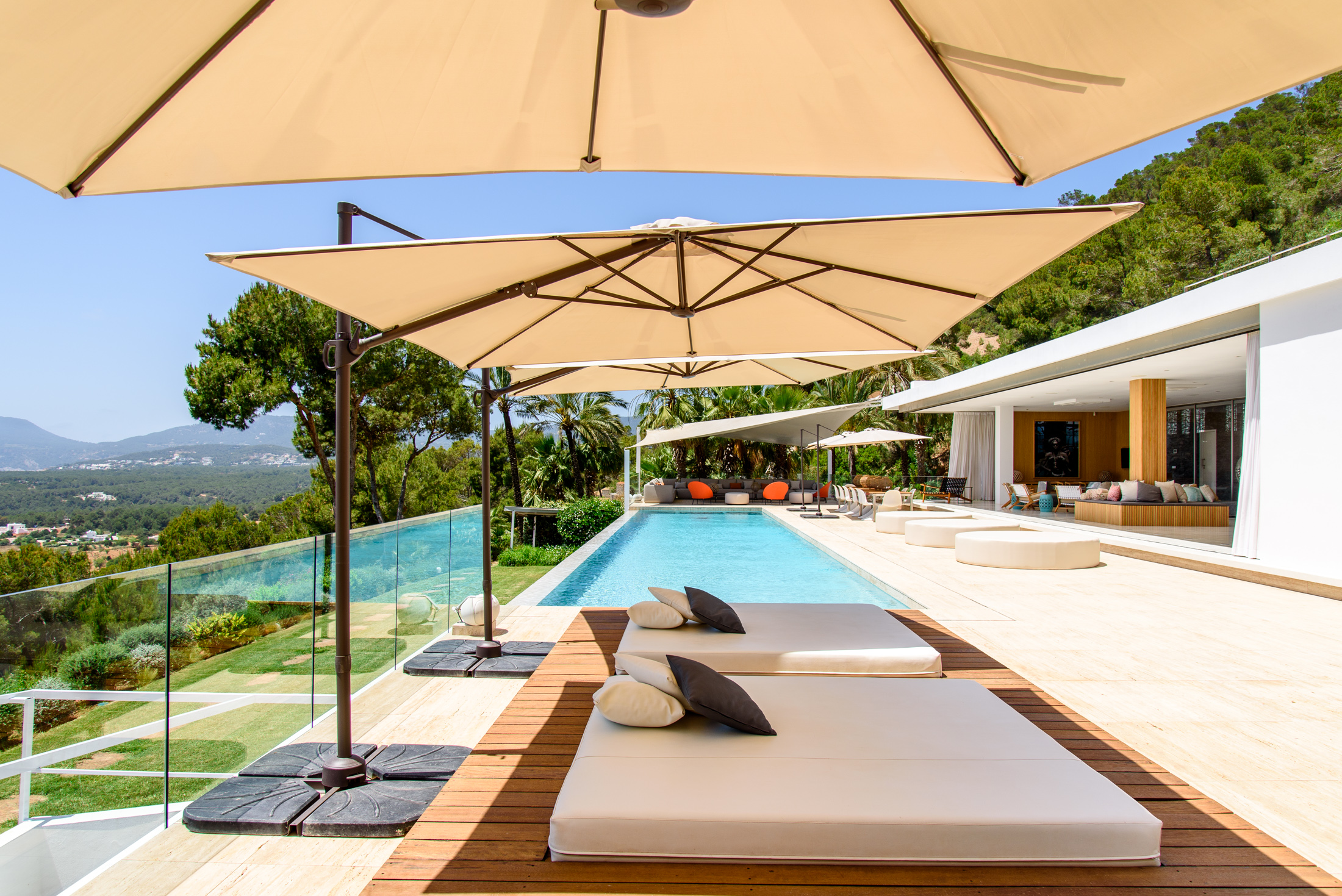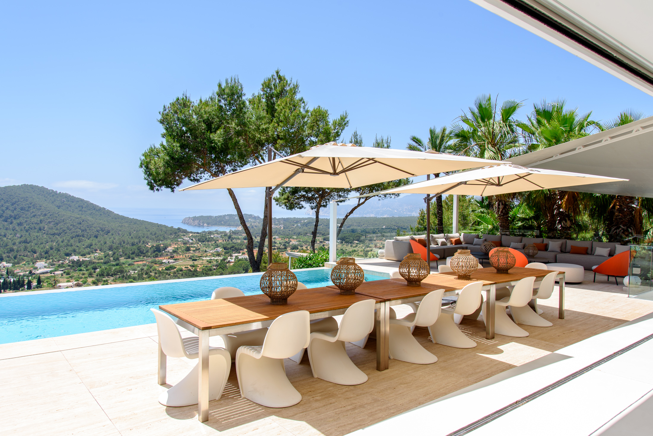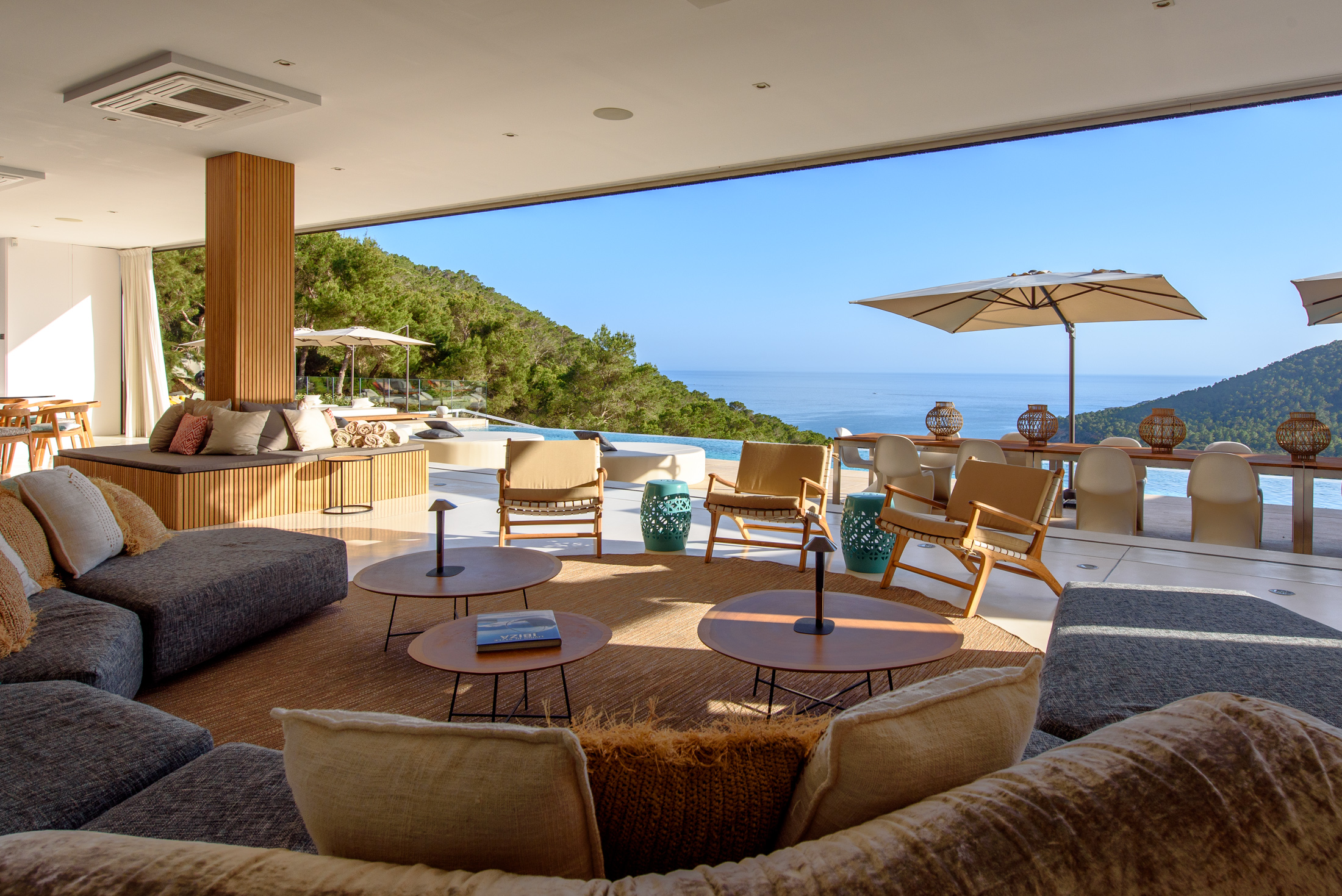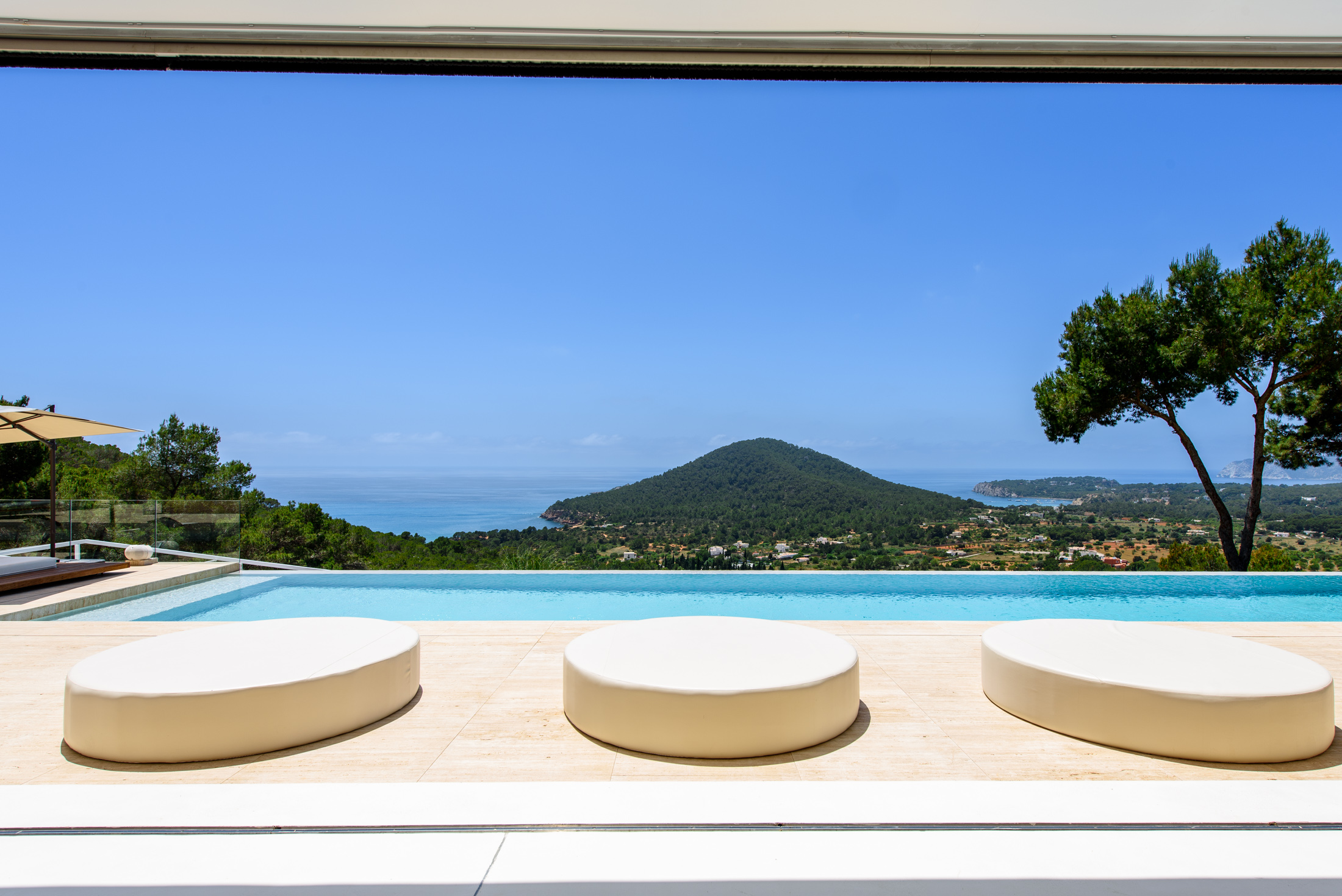 Discover Villa Supreme, a perfectly positioned Modernist villa with extensive floor-to-ceiling glazing that blurs the boundary between indoors and outdoors, offering stunning views of the sea and surrounding countryside. This exceptional six-bedroom villa is elevated, providing a harmony of greenery and calm architectural lines.