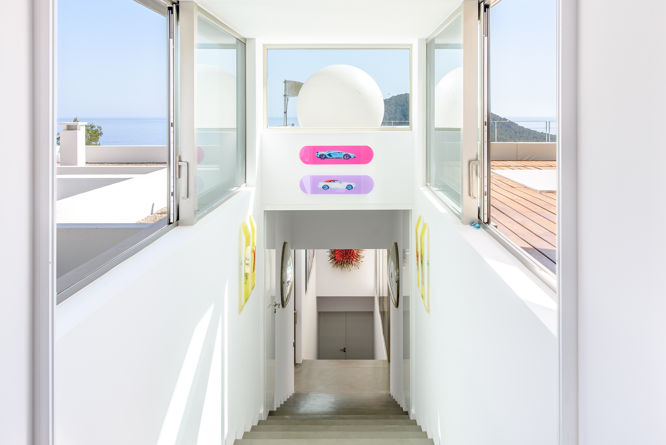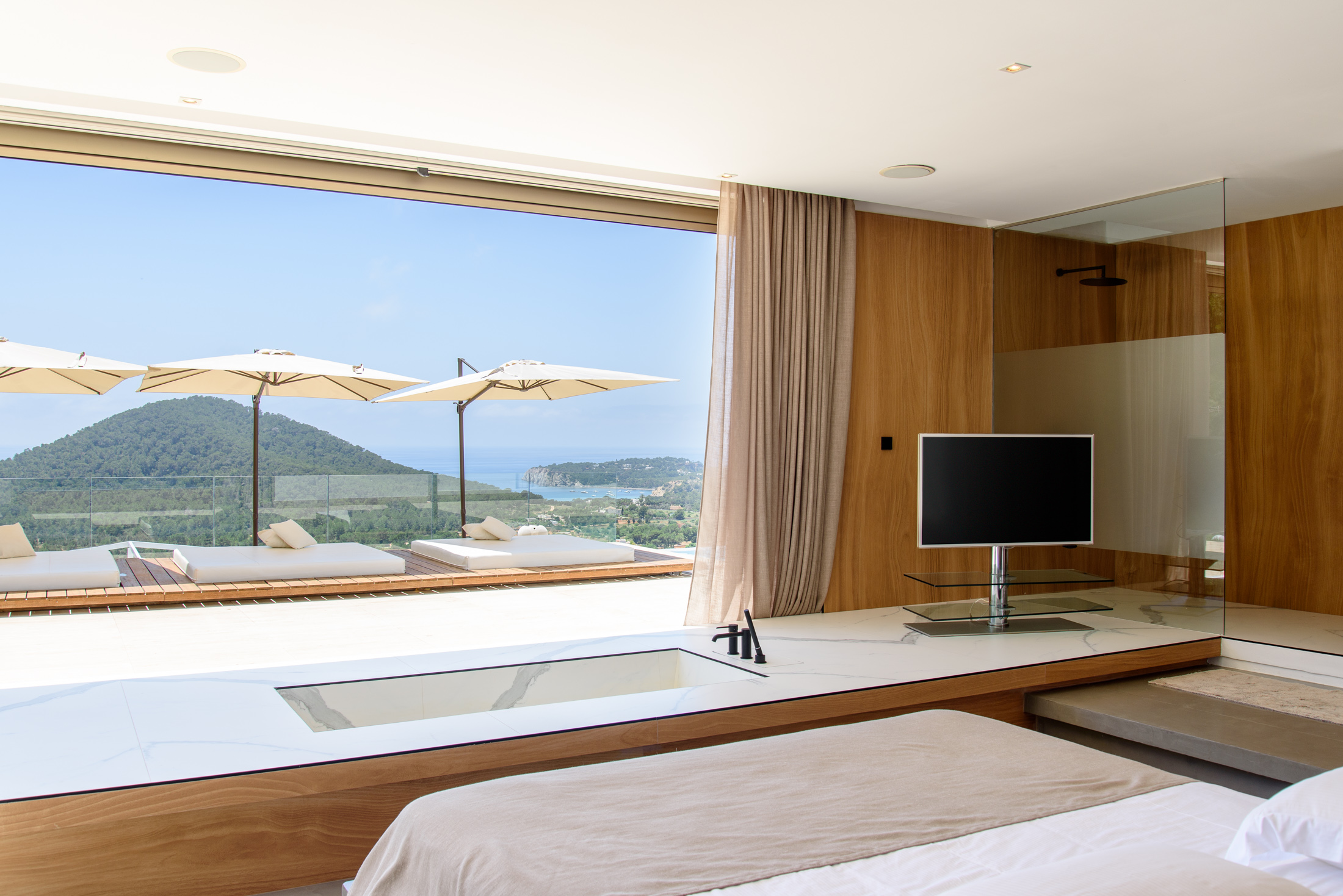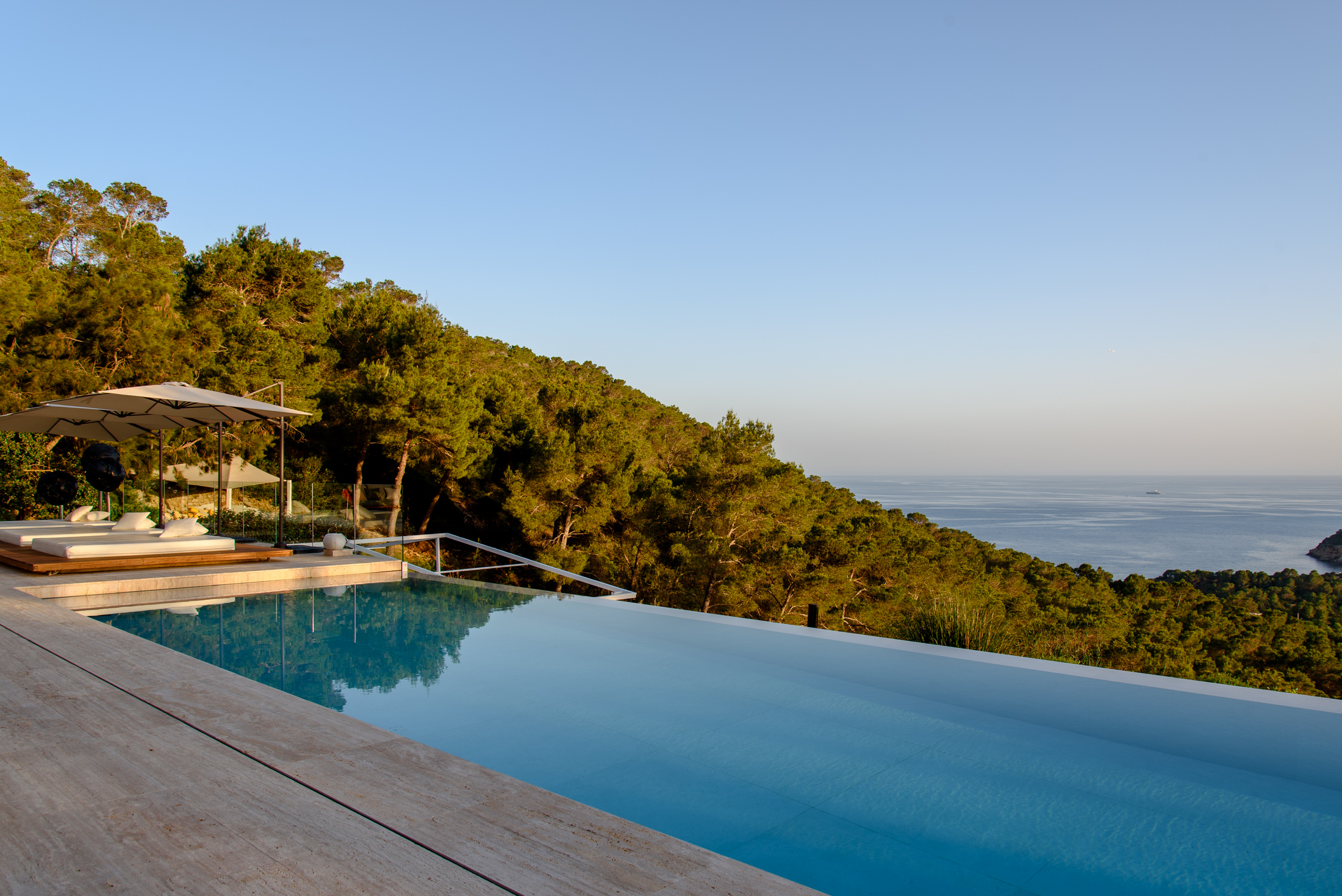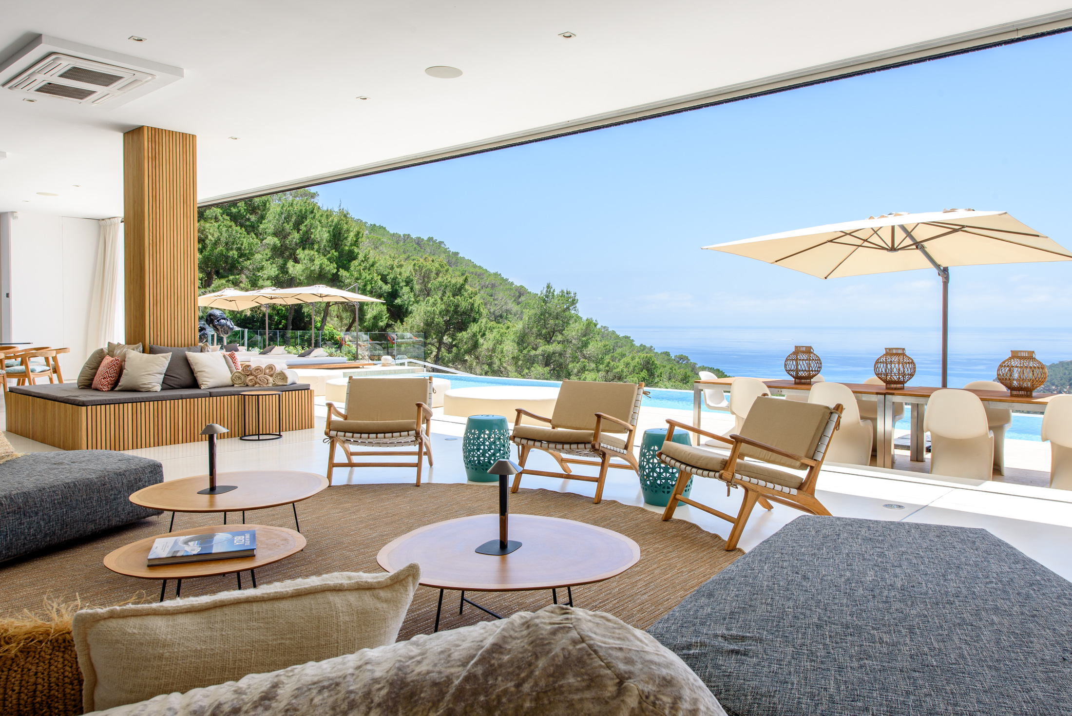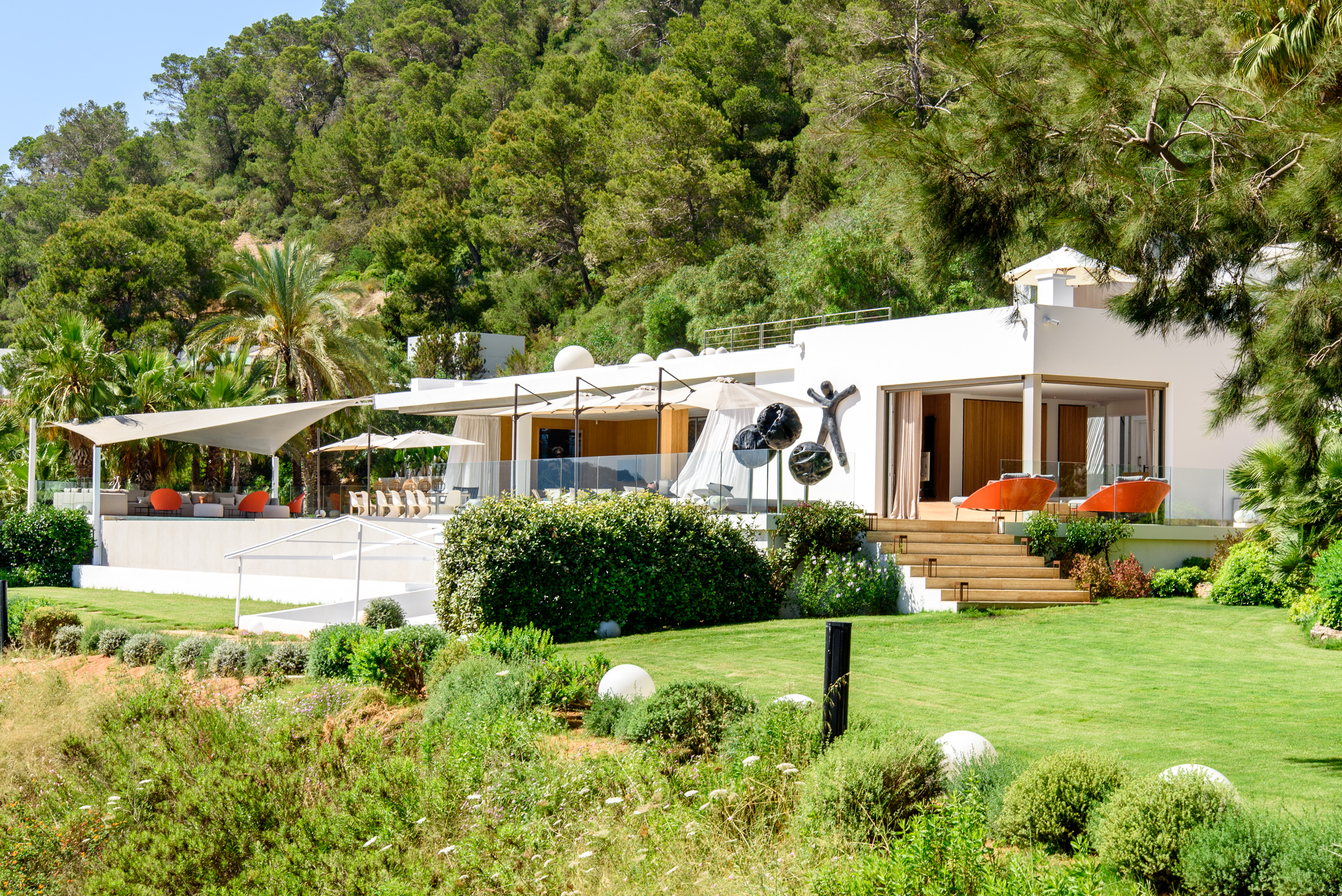 Discover Villa Supreme, a perfectly positioned Modernist villa with extensive floor-to-ceiling glazing that blurs the boundary between indoors and outdoors, offering stunning views of the sea and surrounding countryside. This exceptional six-bedroom villa is elevated, providing a harmony of greenery and calm architectural lines.