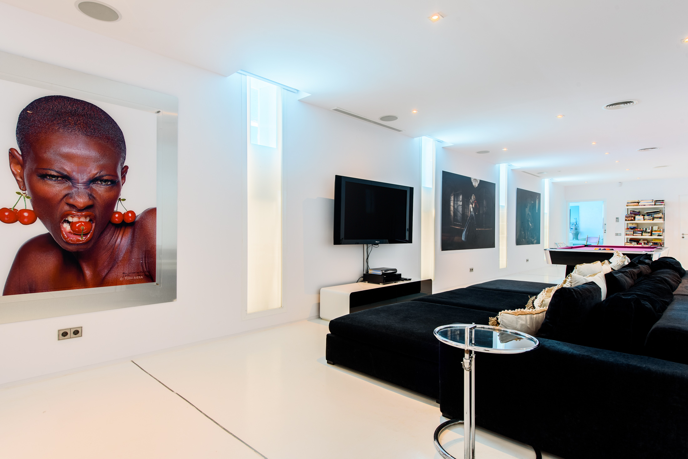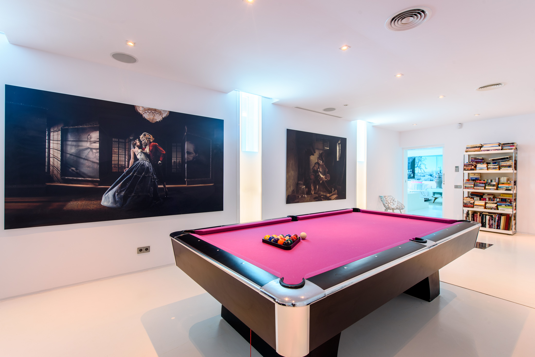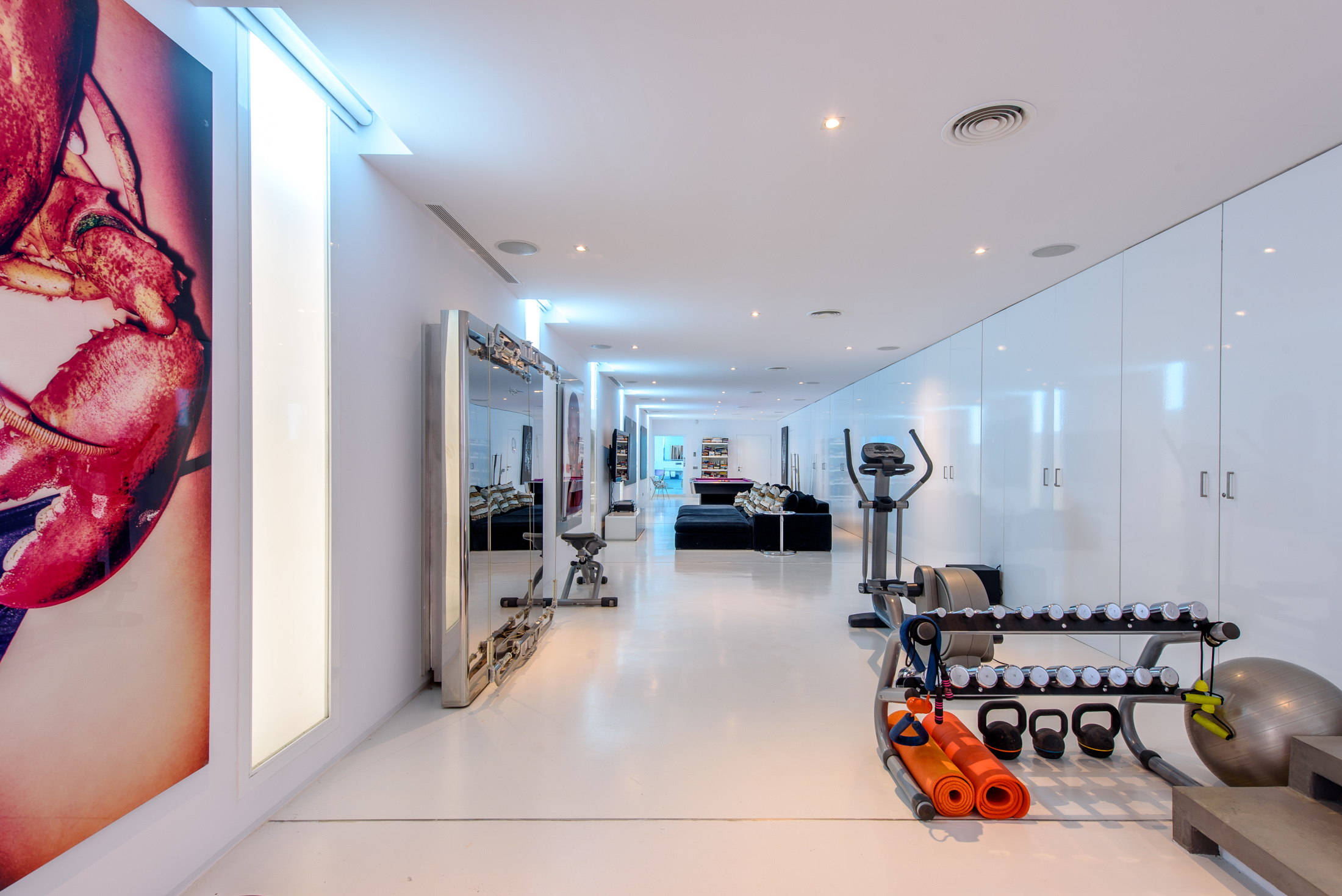 The interiors showcase designer furniture paired with playful soft furnishings, creating a calm and relaxing atmosphere that complements the exceptional architecture. The villa includes a large entertainment area with a professionally fitted gym and a pool table, offering ample space for leisure activities and relaxation.