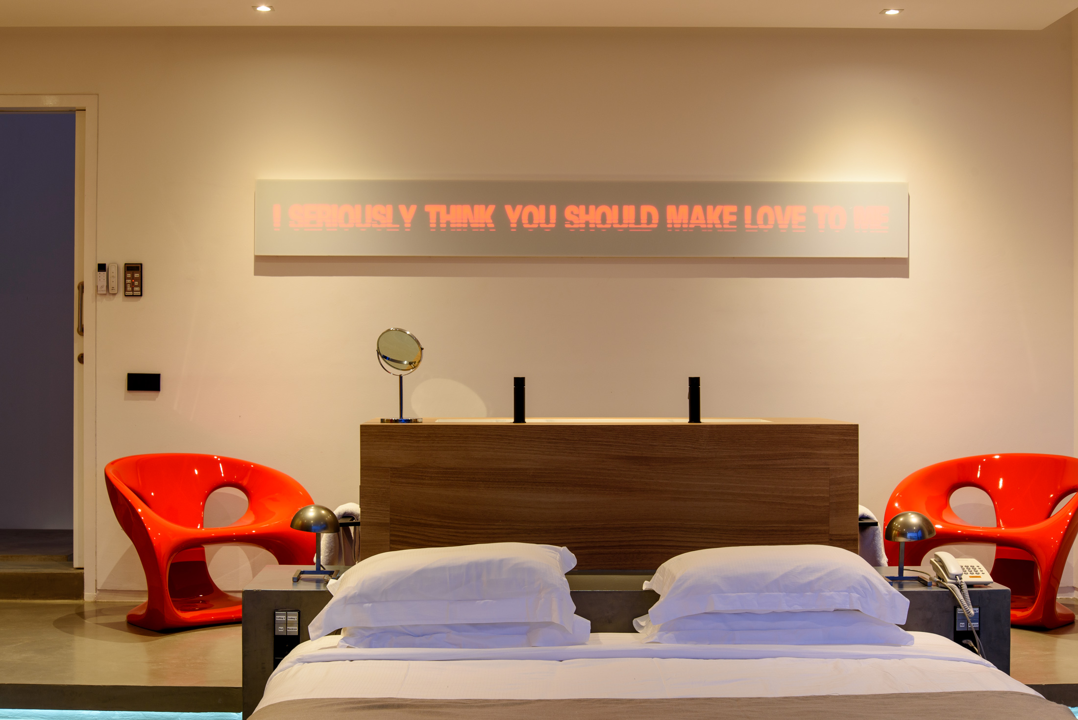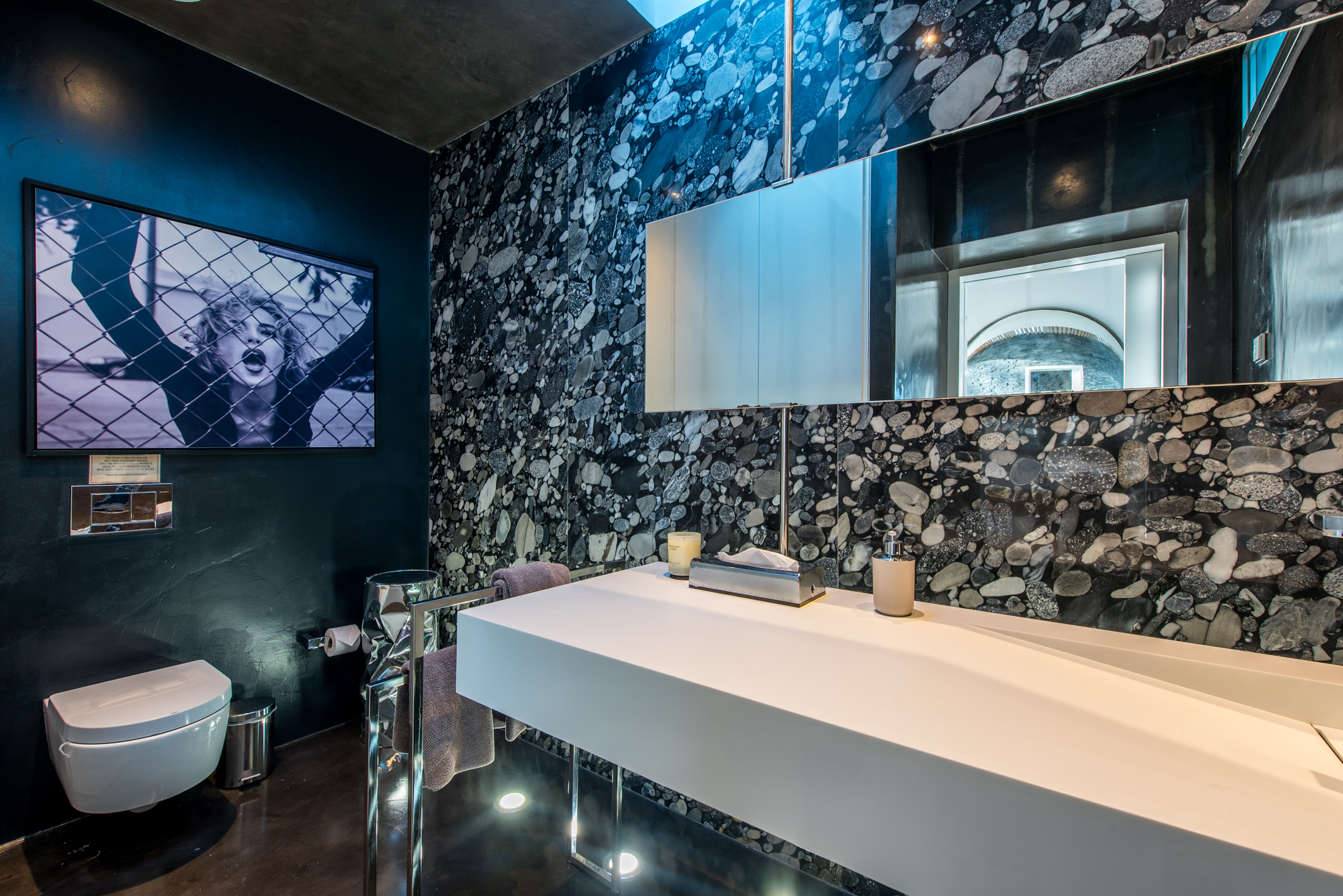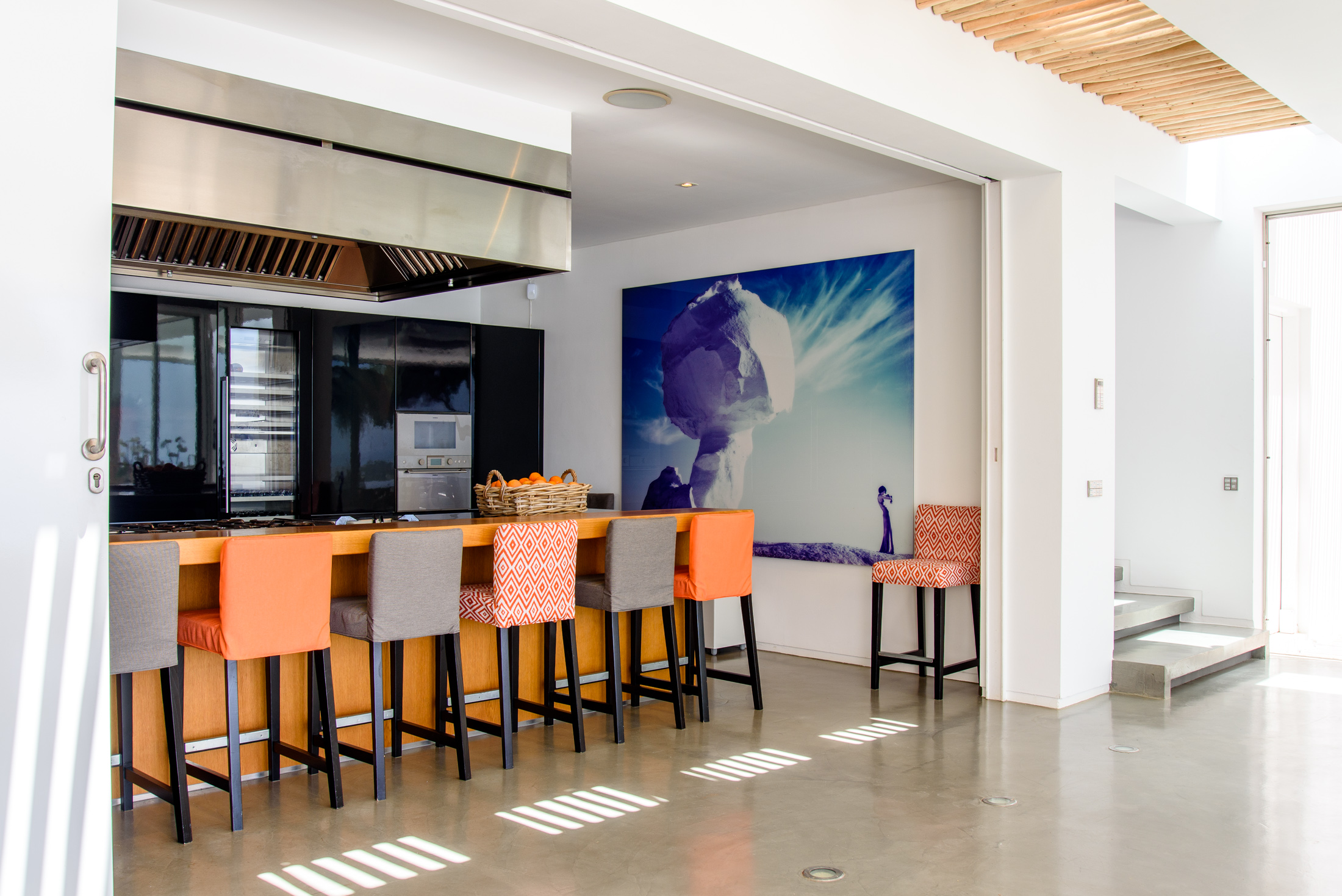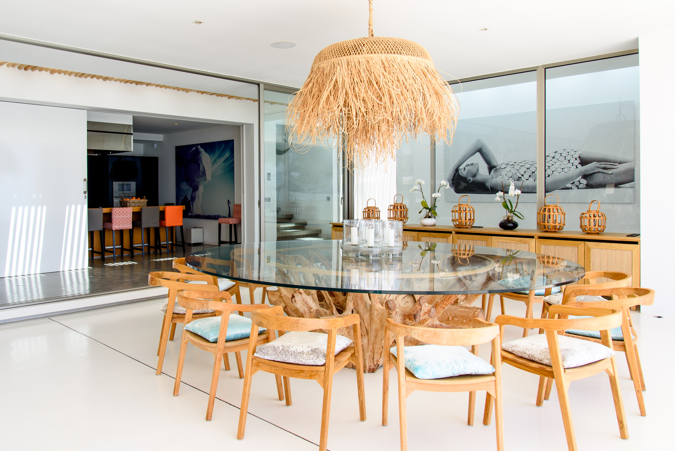 Upon entering, the villa's exceptional panoramic views immediately captivate, drawing your gaze towards the natural beauty that surrounds you. The lateral layout of the living area divides the space with sophistication, featuring clean architectural geometry, white walls, and an abundance of natural light that highlights the owner's art collection. The custom-built kitchen, crafted to the highest standard, boasts precision workstations with textured louvre wooden finishes juxtaposed with stainless steel and brilliant gloss veneers in the cabinetry.